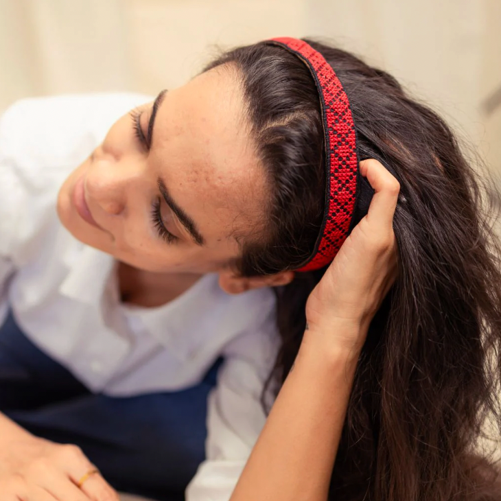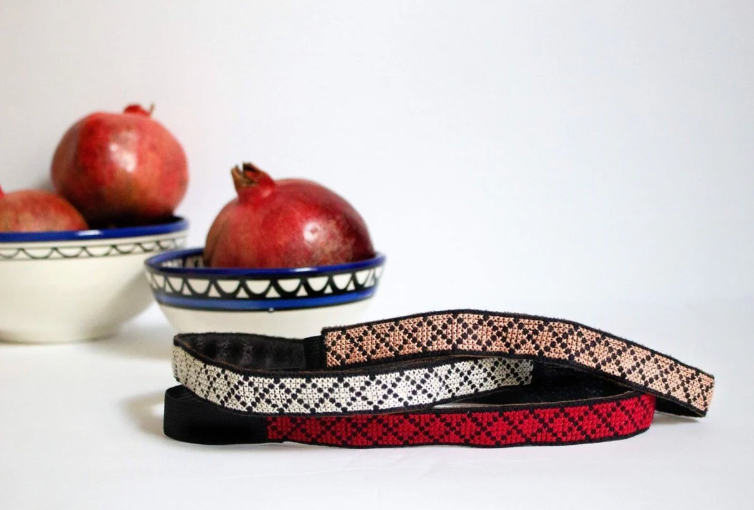 The Amal Headband features the "Baker's Wife" tatreez motif (Mart Al Farran in Arabic). The design takes 1.5 hours for our Darzah artisans to embroider. Your purchase will support 1/5 of a day's empowering work for a talented woman artisan in Palestine.Due to high demand, this style is not currently in stock. Our artisans will begin making this design especially for you as soon as it is safe for them to return to work. Your support and understanding mean the world to us and make a genuine difference in the lives of our artisan partners in Palestine.