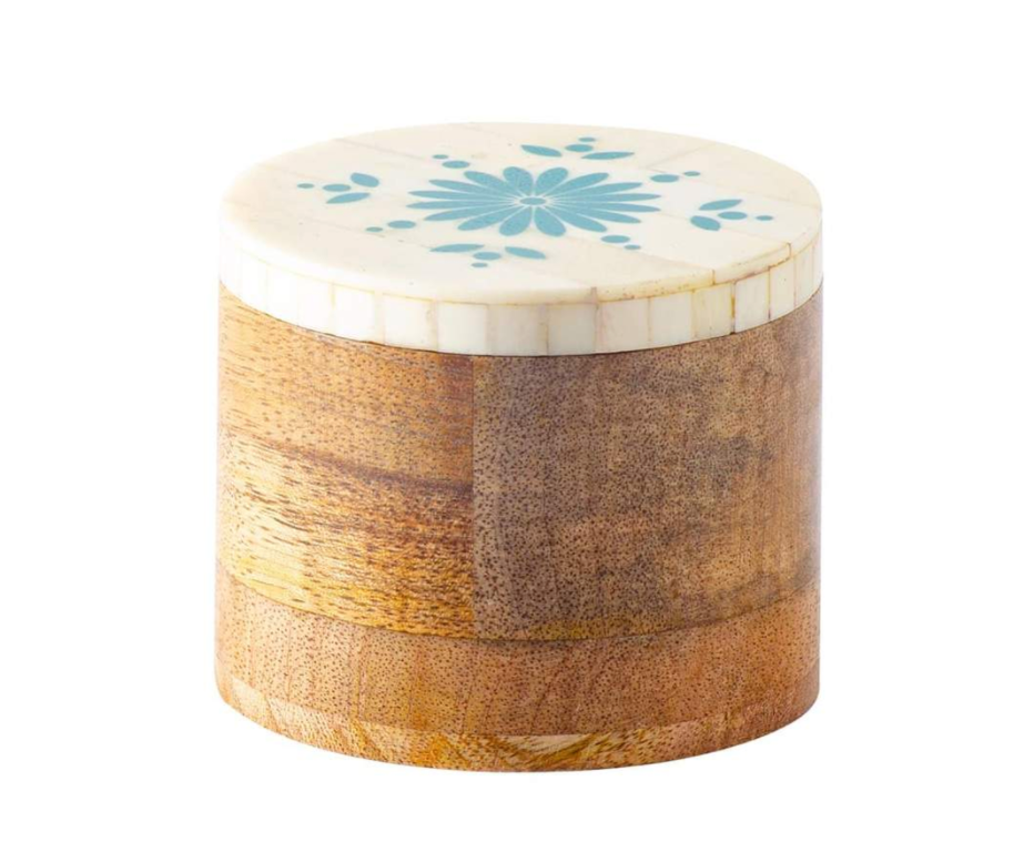 Our handcrafted Ankura Keepsake Box Collection incorporates traditional Indian art forms in modern designs, featuring sustainably harvested mango wood, ethically sourced bone, and screen printed flora and fauna inspired designs. Master artisans in Old Delhi skillfully hand carve wood and bone elements to create elegant designs with a refined finish. This handcrafted, round keepsake box is thoughtfully designed for stylish safekeeping. The hand carved bone lid features a flora inspired bloom design. The lid lifts completely to reveal a cylindrical, open interior.