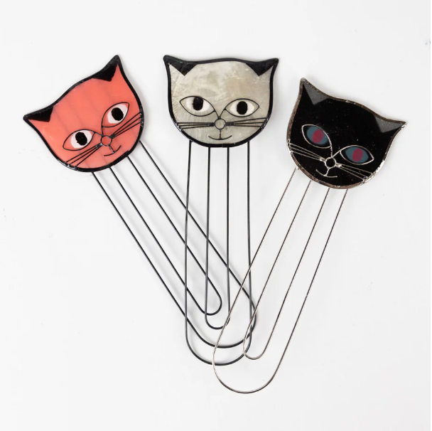 Kitty keeps your place in the book. Cat-themed bookmark is handcrafted from capiz shell and wire. Capiz is the thin shell of a marine mollusk. First artisans wash and soak shells. After the shells have dried, they are cut into shapes and edged with metal wire. A finishing coat of varnish completes this labor-intensive process. Before glass windows became available in the Philippines, capiz was used for windows in houses.