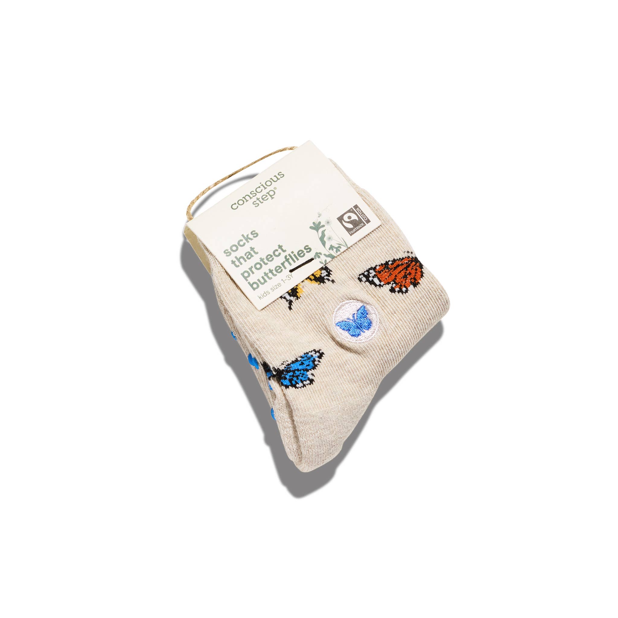 Our butterfly socks are perfect for kids who love to spread their wings and explore! Designed with bright butterflies and a cozy fit, these fluttery fun socks are ready for any and all backyard adventures. • Each sale of this pair donates to Pollinator Partnership, supporting their mission to build habitat and awareness for pollinators which are critical to food security as well as human and planetary health. • Toddler (1-3Y) fits kids shoe sizes 3-7k. Preschool (4-6Y) fits kids shoe sizes 9-13k. Youth (7-10Y) fits kids shoe sizes 2-5. • Toddler pair has silicone grippers for sliding. • Sustainable • Certified Organic • Certified Fairtrade • Certified Vegan • Members of 1% for the Planet