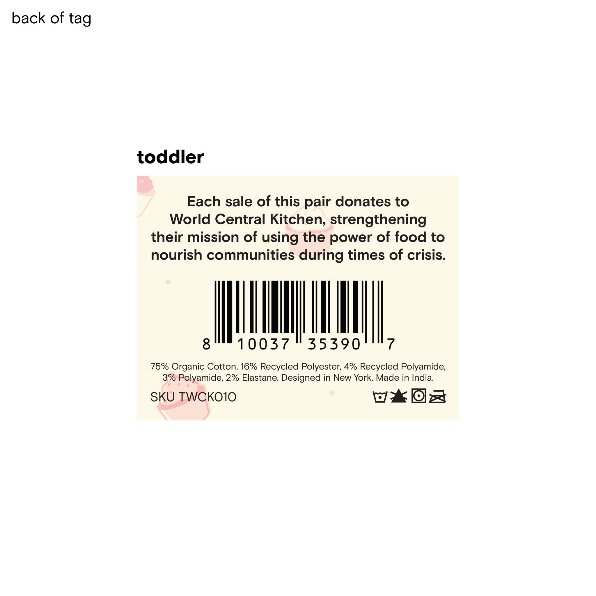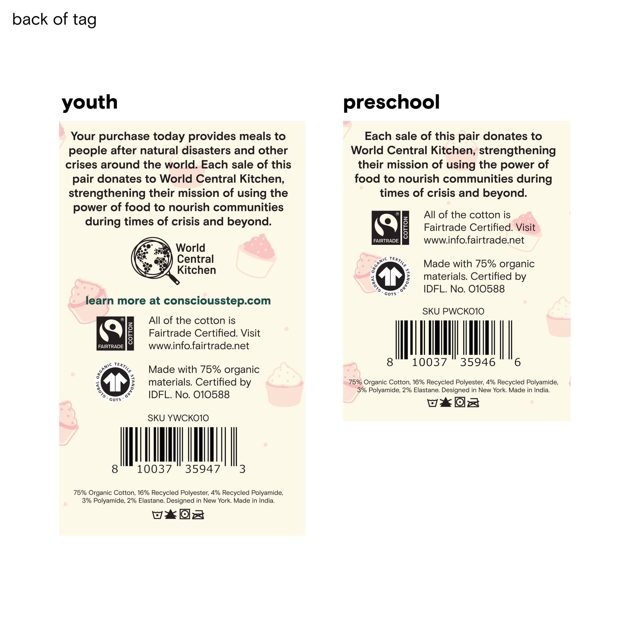 Socks that are ready to be the icing on top of any outfit they choose! Sweeten up their sock game and make every day feel like a birthday celebration with these blue cupcake-patterned socks. • Each pair supports World Central Kitchen and their work to provide meals to people in need when disaster strikes. • Toddler (1-3Y) fits kids shoe sizes 3-7k. Preschool (4-6Y) fits kids shoe sizes 9-13k. Youth (7-10Y) fits kids shoe sizes 2-5. • Toddler pair has silicone grippers for sliding. • Sustainable • Certified Organic • Certified Fairtrade • Certified Vegan • Members of 1% for the Planet
