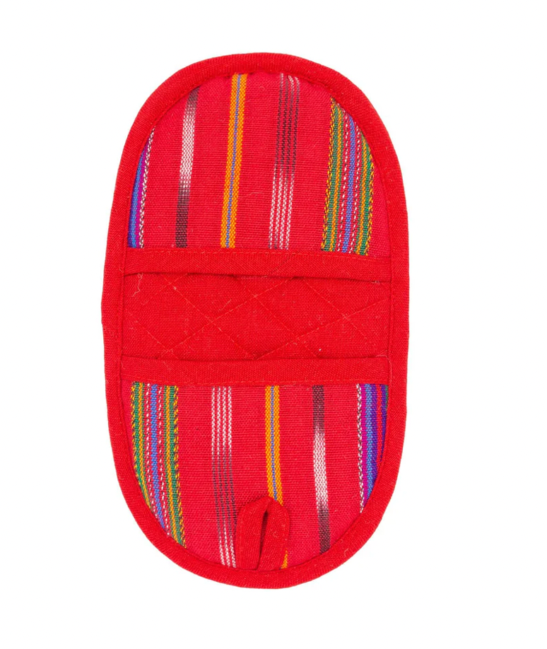 Our double-ended oval potholder protects your delicate fingers from the heat! Simply slide your fingers snugly into the padded pockets...et voila! Handmade. 9"x 5" 100% cotton. Machine washable assorted colors.