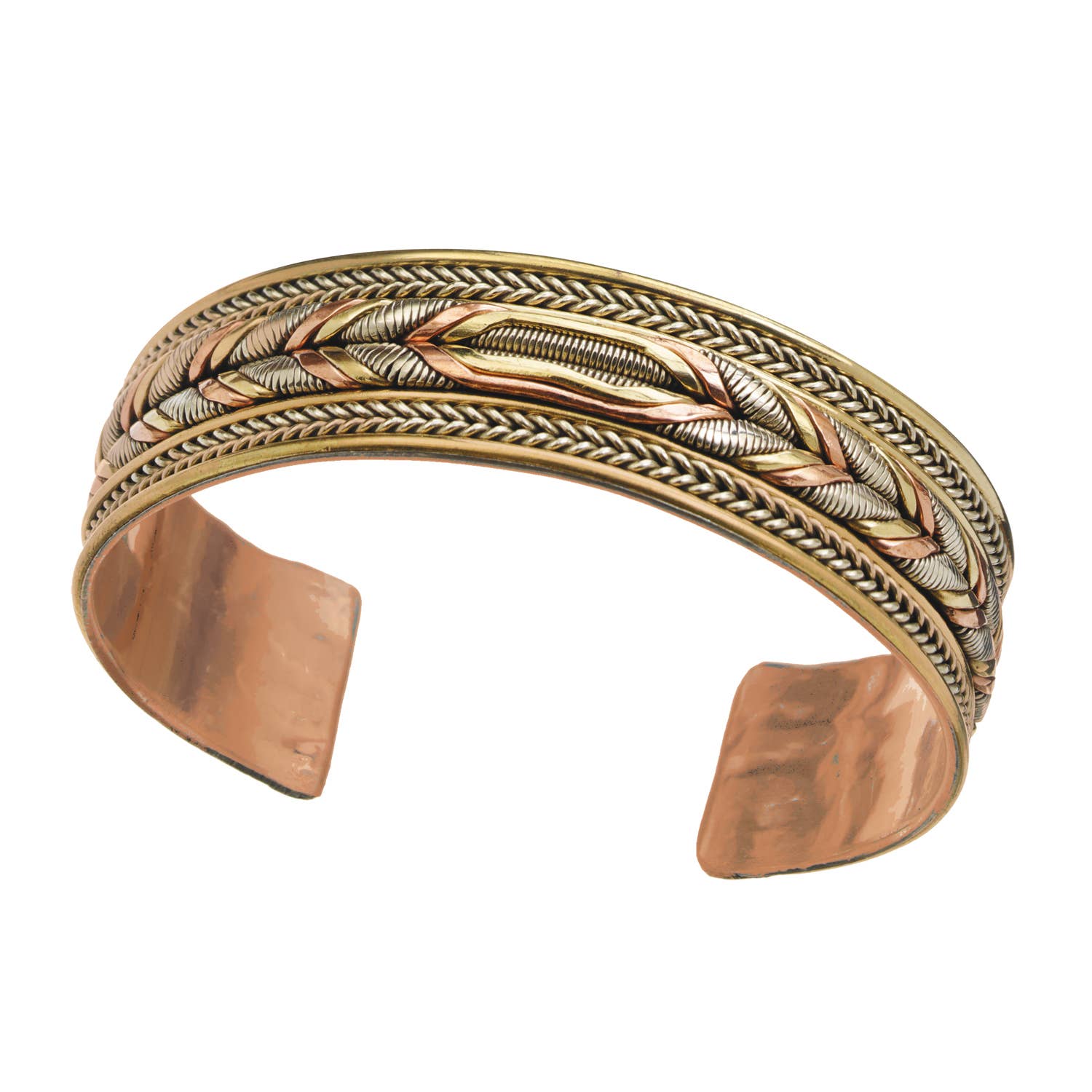 Traditional Tibetan healing bracelets are handmade with interwoven brass, copper and Tibetan silver, metals believed to have healing properties that balance inner energies and can alleviate symptoms of arthritis, tendonitis and carpal tunnel. Bends to fit most wrist sizes. Comes with an attractive and informative hang tag/booklet. Size .7"w