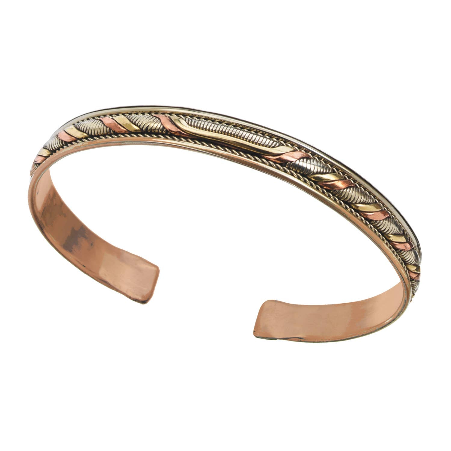 Traditional Tibetan healing bracelets are handmade with interwoven brass, copper and Tibetan silver, metals believed to have healing properties that balance inner energies and can alleviate symptoms of arthritis, tendonitis and carpal tunnel. Bends to fit most wrist sizes. Comes with an attractive and informative hang tag/booklet. Size .3"w