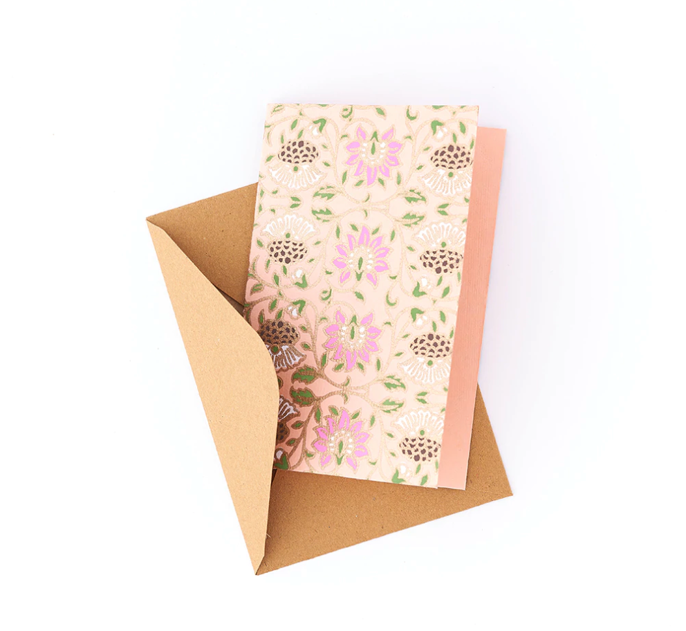 Set of eight handcrafted, 100% tree-free recycled cotton paper note cards with brown kraft paper envelopes. Artisans collect cotton waste and turn it into a pulp to create a rich paper...