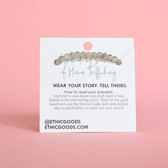 FRIENDSHIP AKA: Bestie, BFF, Best Secret Keeper EVER. This bracelet looks great alone or stacked with your other favorite Morse Code or stone stacking bracelets! How to read your jewelry: A Morse Code dot is one bead and a dash is two beads in the alternating color. Start at the small gold spacer bead and follow the Morse Code spelling around the bracelet! Your purchase helps to provide economic empowerment for women who are survivors of human trafficking and exploitation. Each piece is handcrafted by the woman it helps to employ. Through wearing Ethic Goods, you become a meaningful part of her story, and give freedom to women around the world. Details * Length - 6.75" | Stretches to 7.5 * Handmade with love in Thailand * Made with semi-precious stones, hematite, glass beads, and elastic.