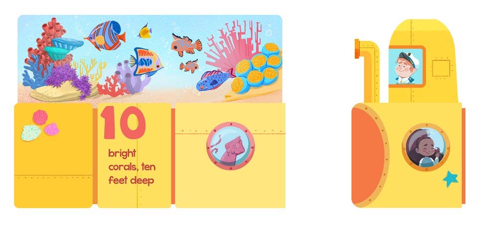 Author Christopher Robbinsand illustrator Susanna Covelli’s Ocean Train is an interactive primer that teaches numbers and sea creature names to children, providing a colorful, educational, and toy-like learning experience that makes learning fun. Ahoy! Take a dive under the sea with Ocean Train. With a yellow submarine engine, little nautical explorers will love this 56-inch fold-out train (perfect for playtime or room decor)! Printed on both sides with boldly colored underwater illustrations, the book includes a handy velcro clasp to keep everything snuggly shut when reading time is over.
