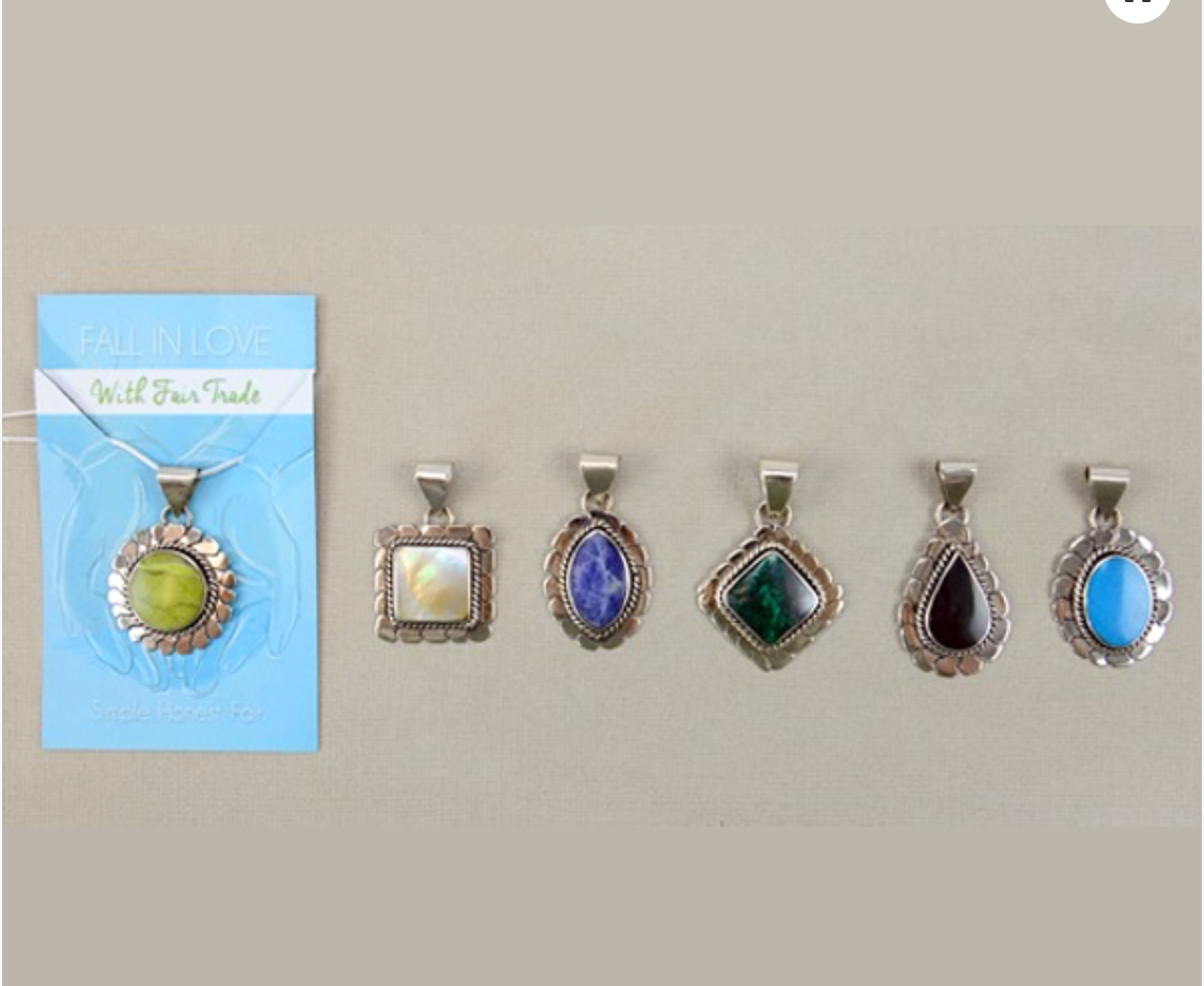 Beautifully framed cabochons of semi-precious stones in alpaca silver. Comes in various shapes and colors. Silver chain included. Made in Perú.Please inquire about current selection.