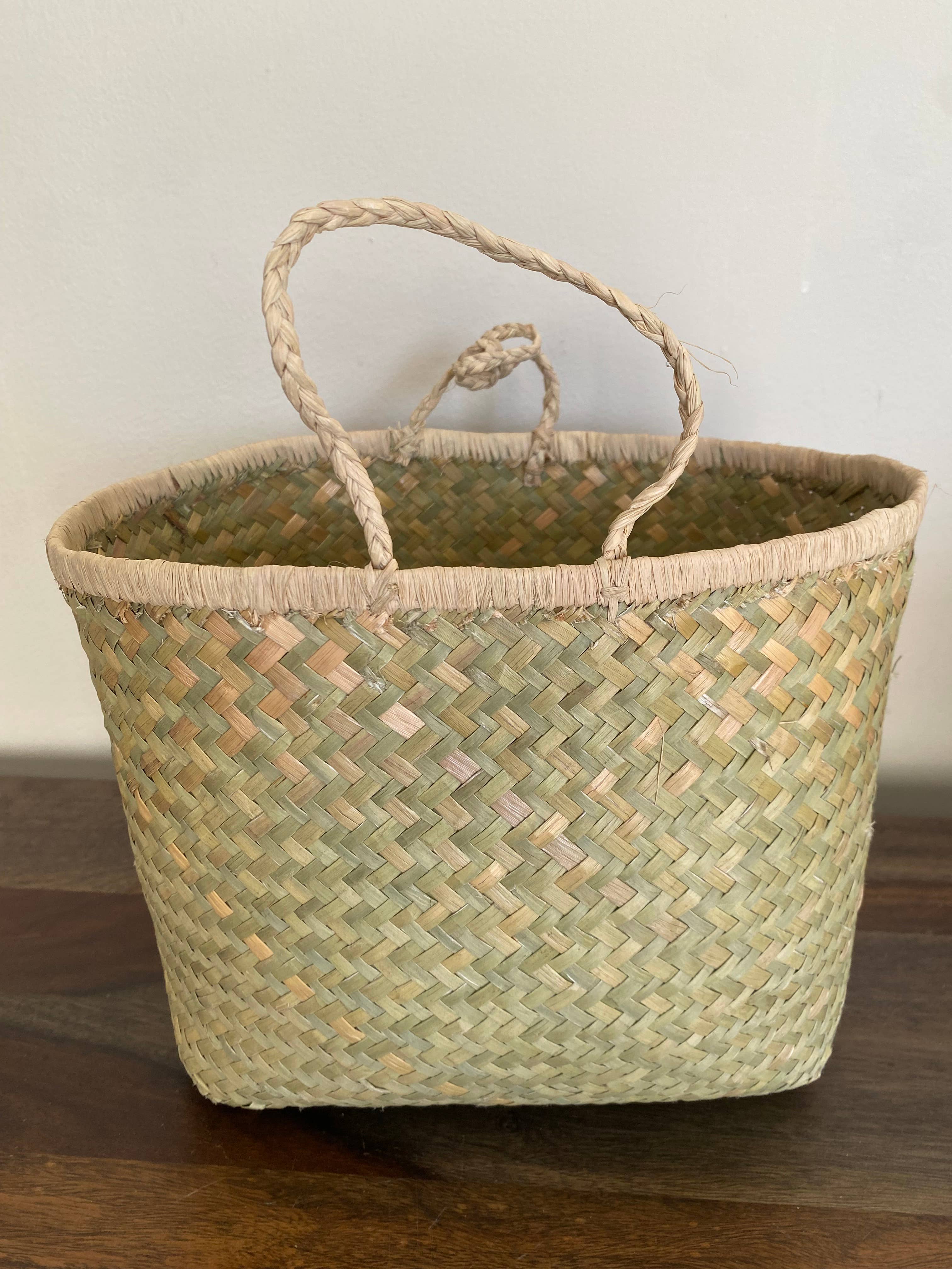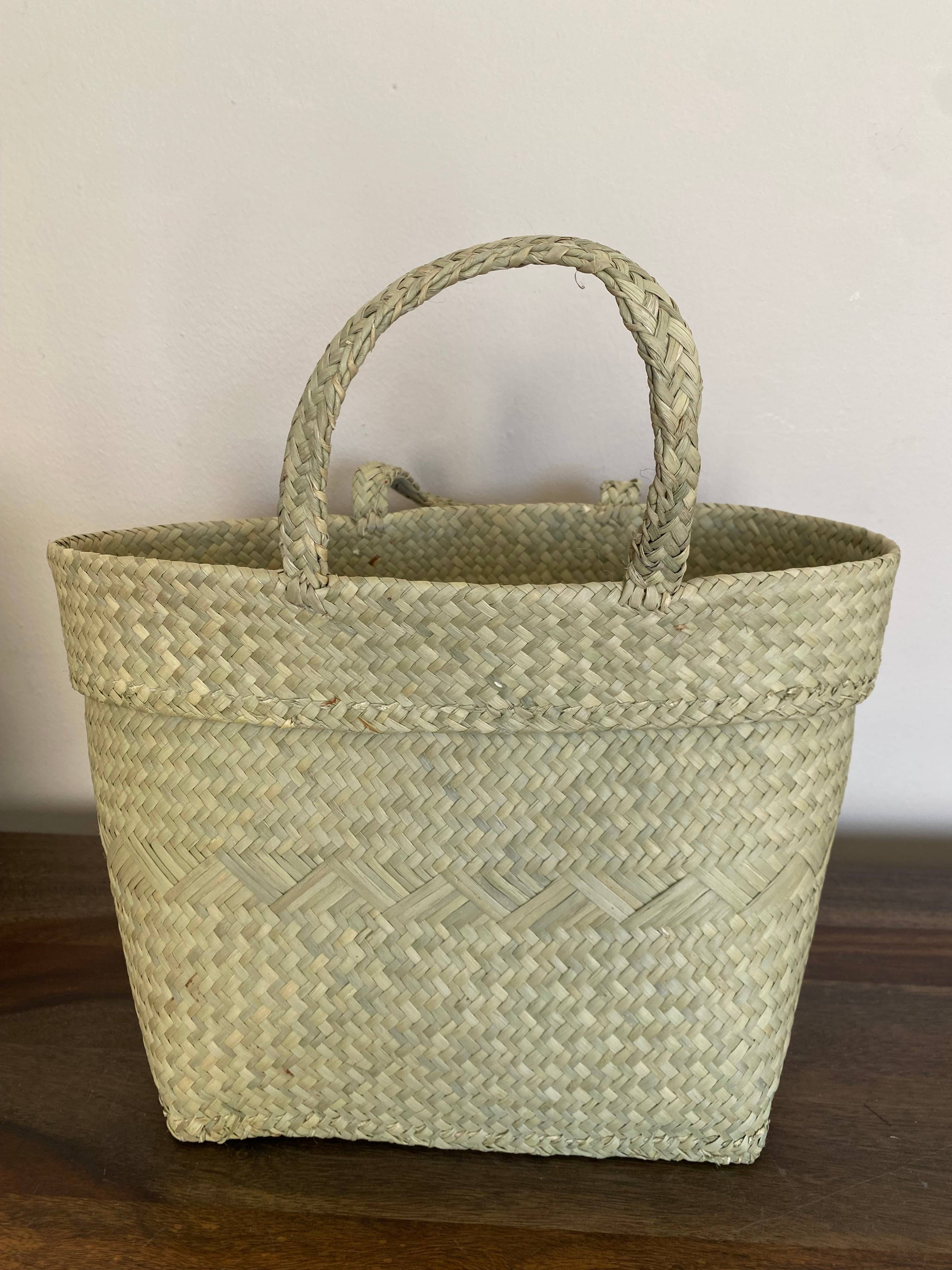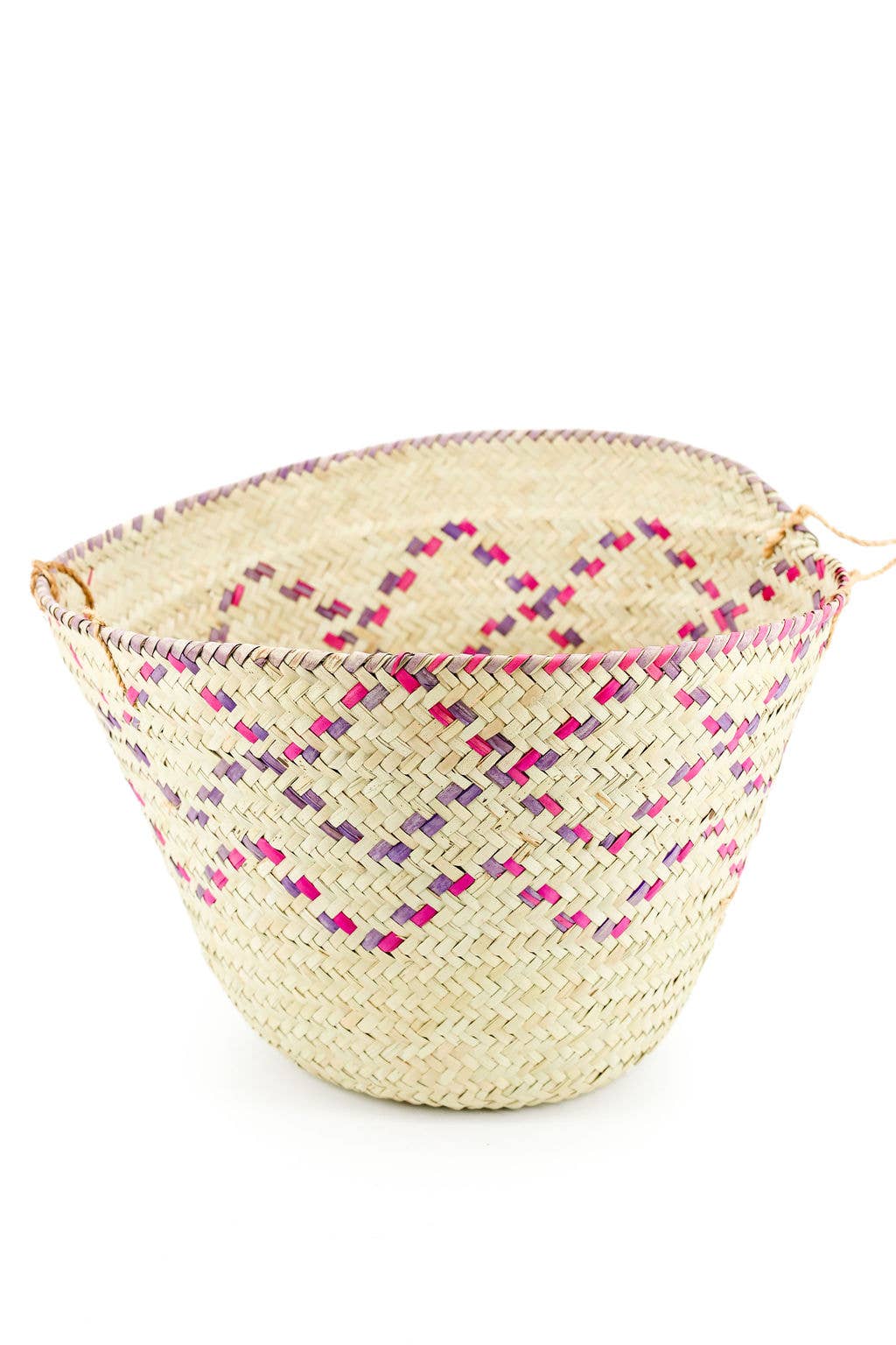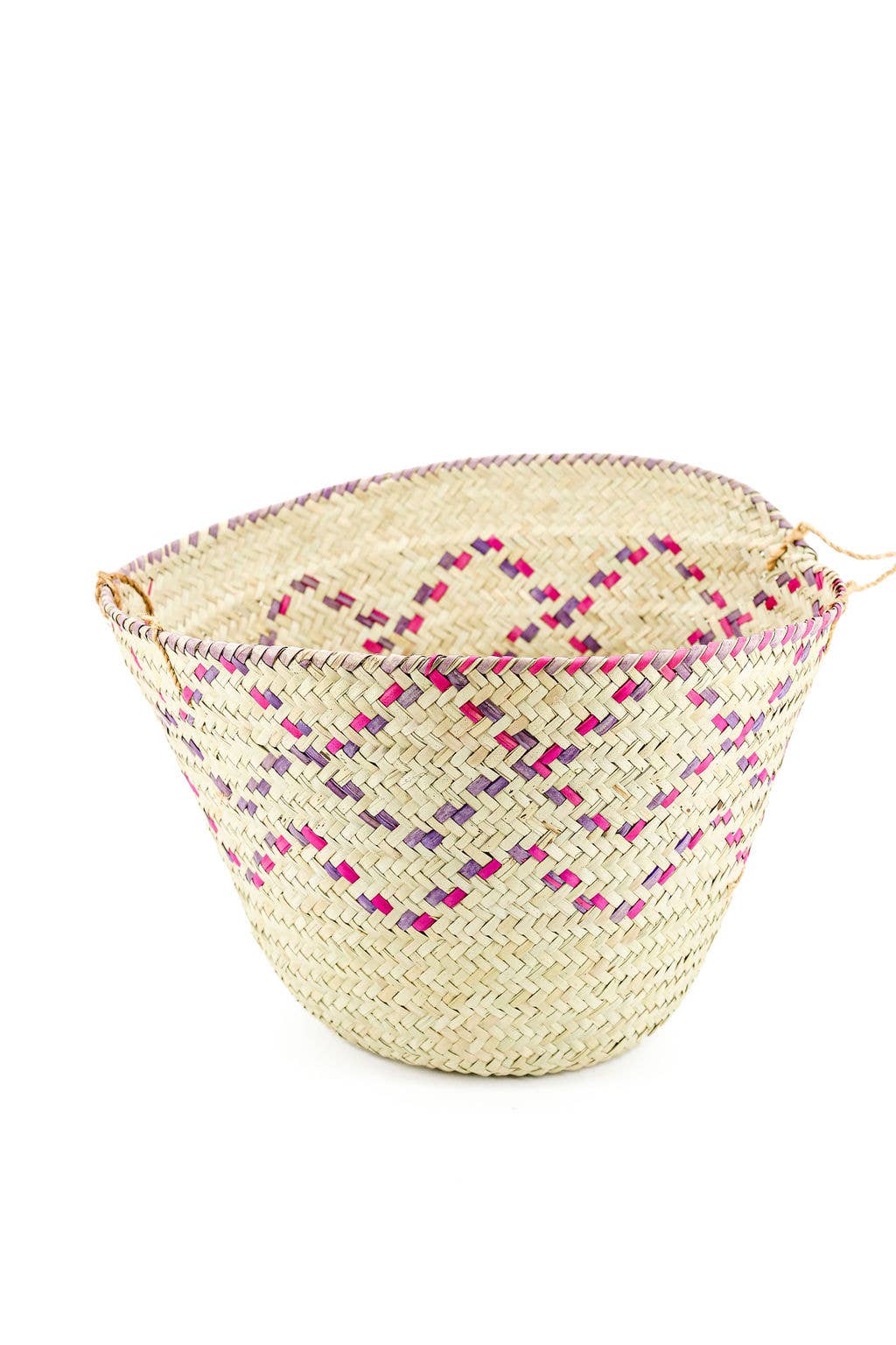 Our vegan, fair trade Kikapu hamper is used most frequently as a laundry or grocery basket. Handmade from finely woven palm leaves, with twine handles. Available in two sizes: Large with multi-colored trim, and small with natural trim.