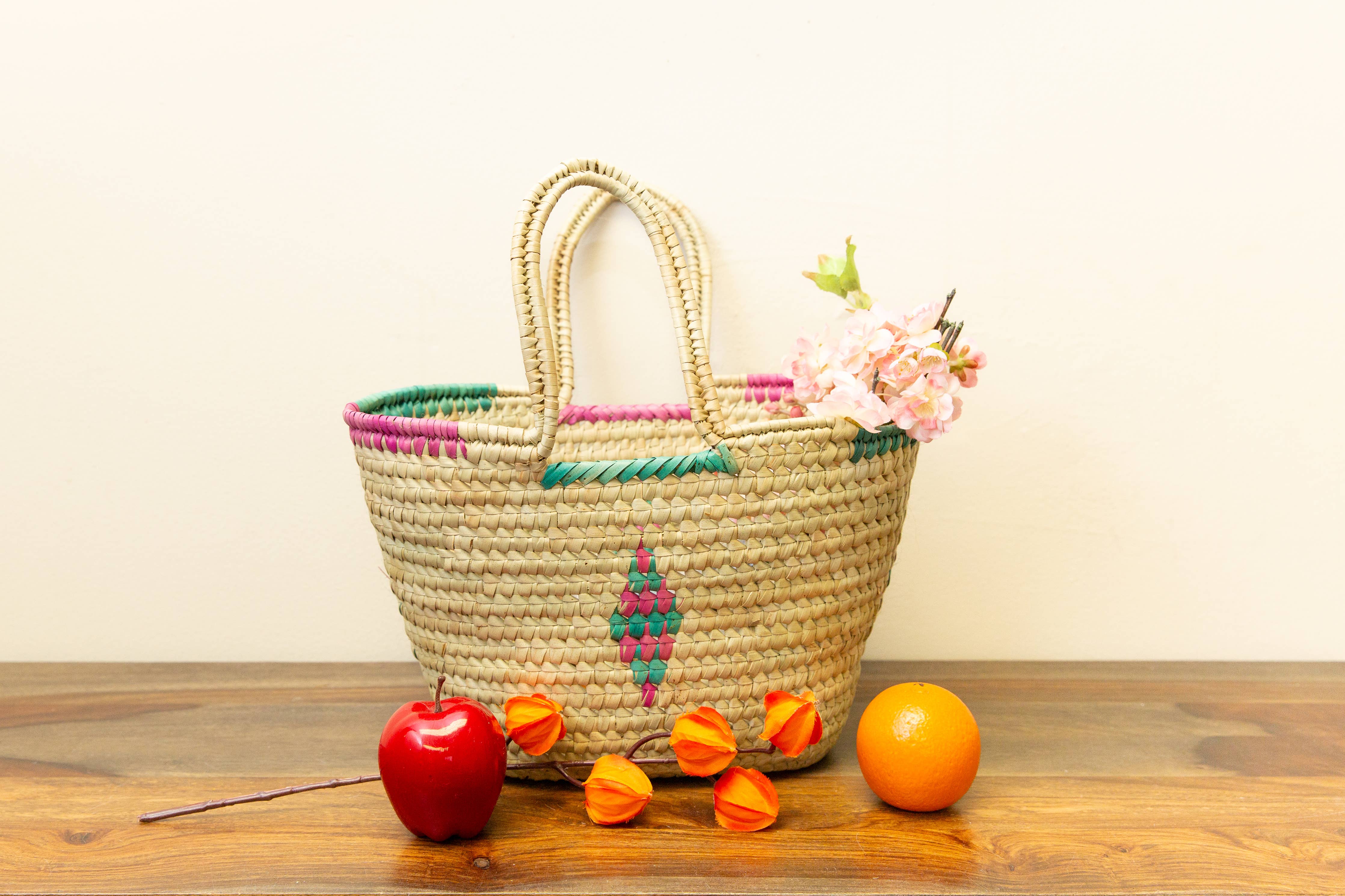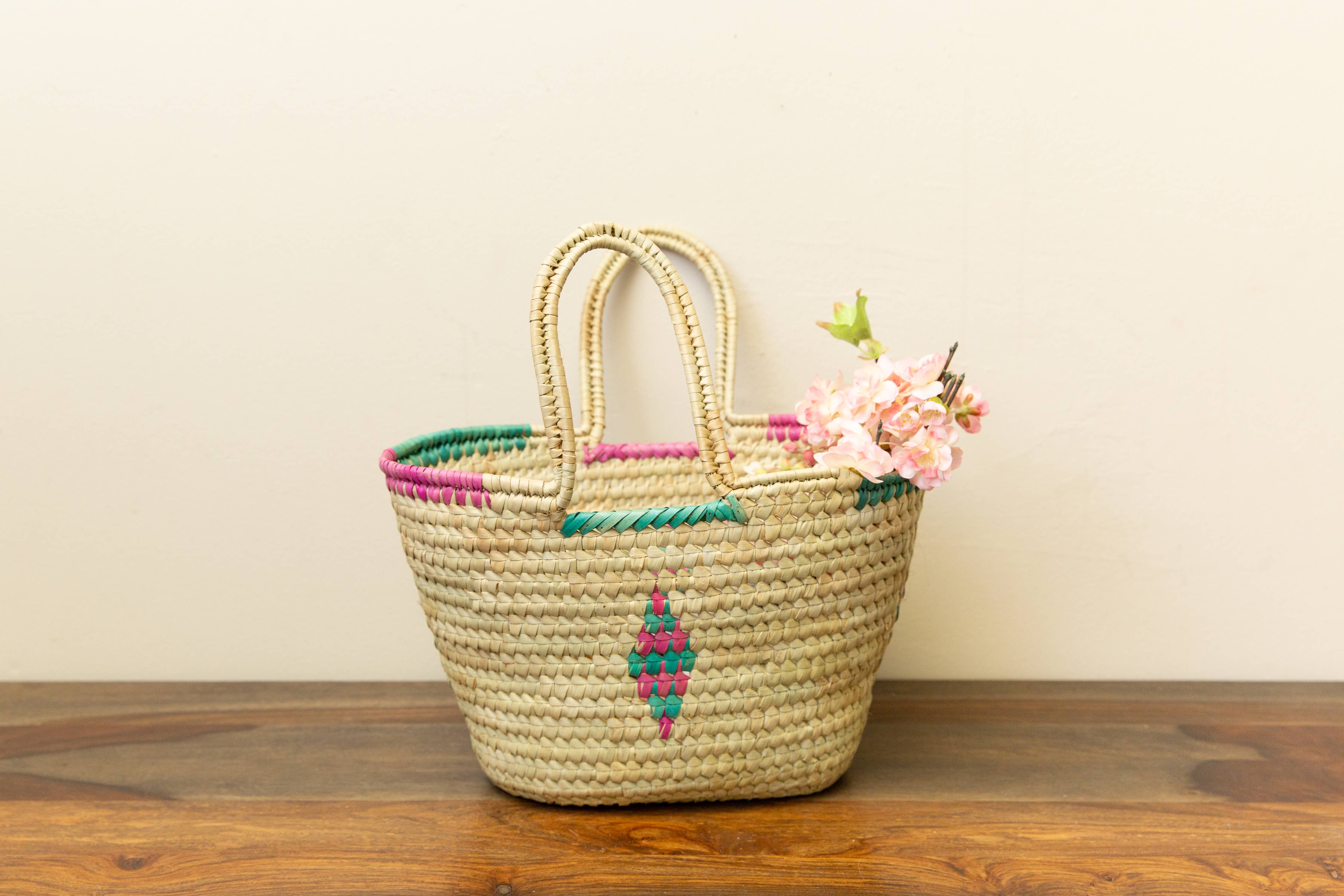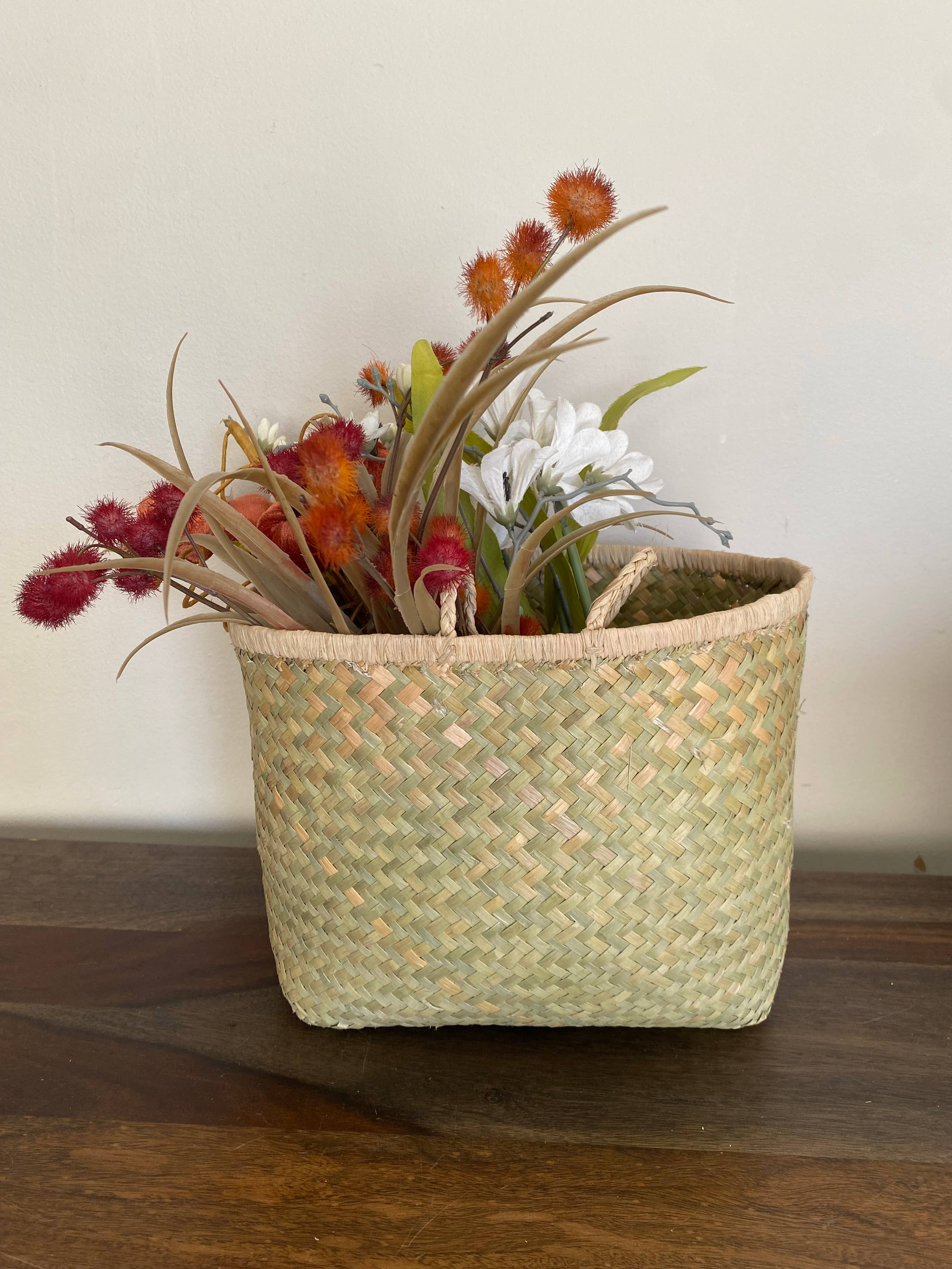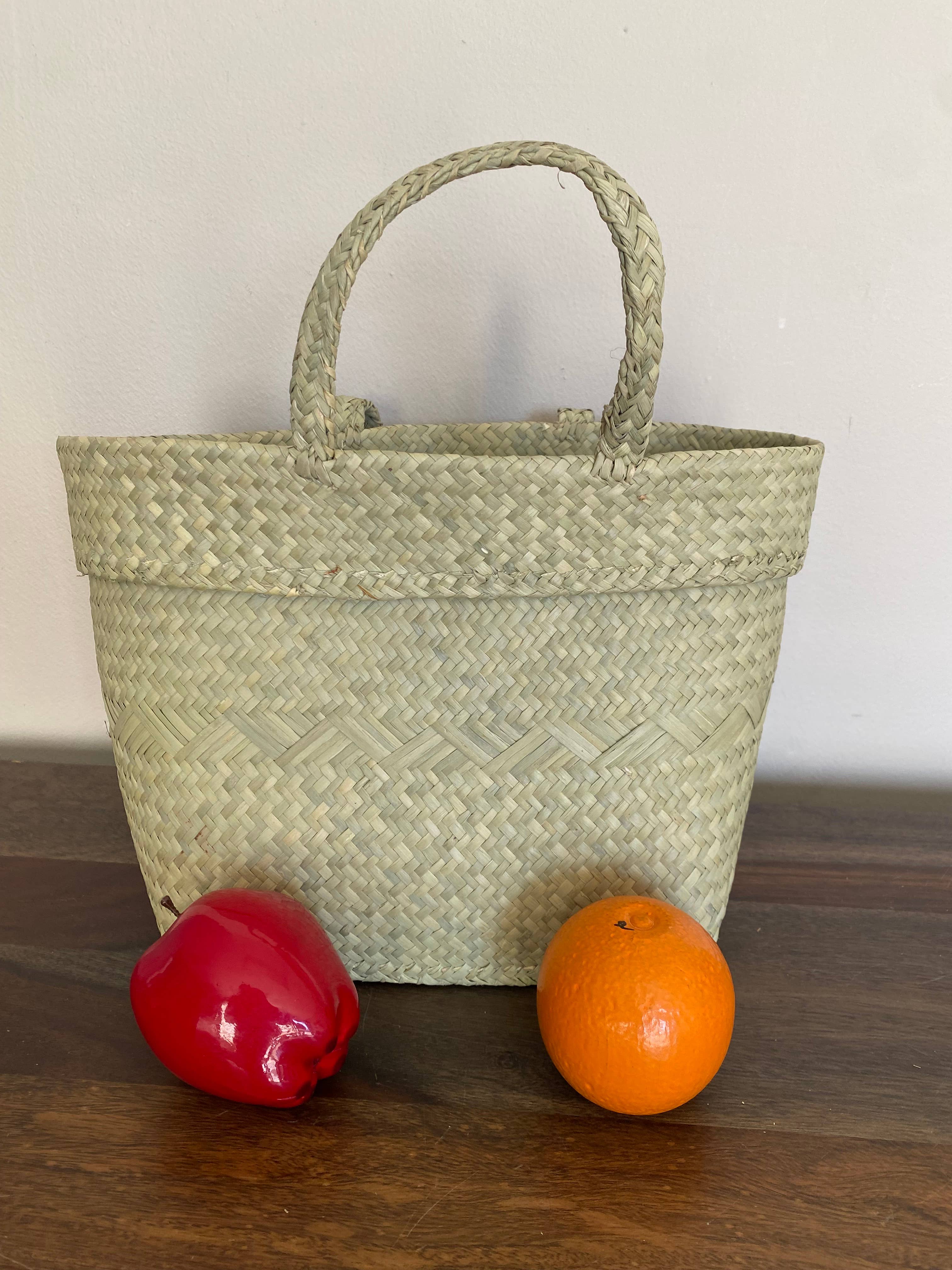 Our vegan, fair trade Kikapu hamper is used most frequently as a laundry or grocery basket. Handmade from finely woven palm leaves, with twine handles. Available in two sizes: Large with multi-colored trim, and small with natural trim.