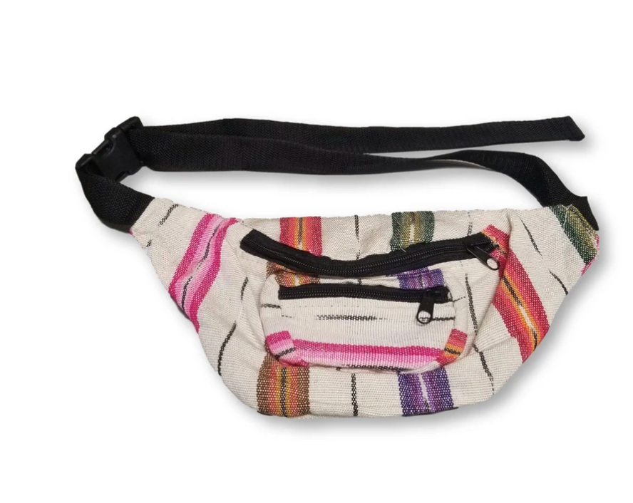 Our colorful fanny packs are hand made with traditional foot loomed fabric from Guatemala. They are a multi-pocket fanny pack with an adjustable waist strap. Three zippered pockets for all your goodies!