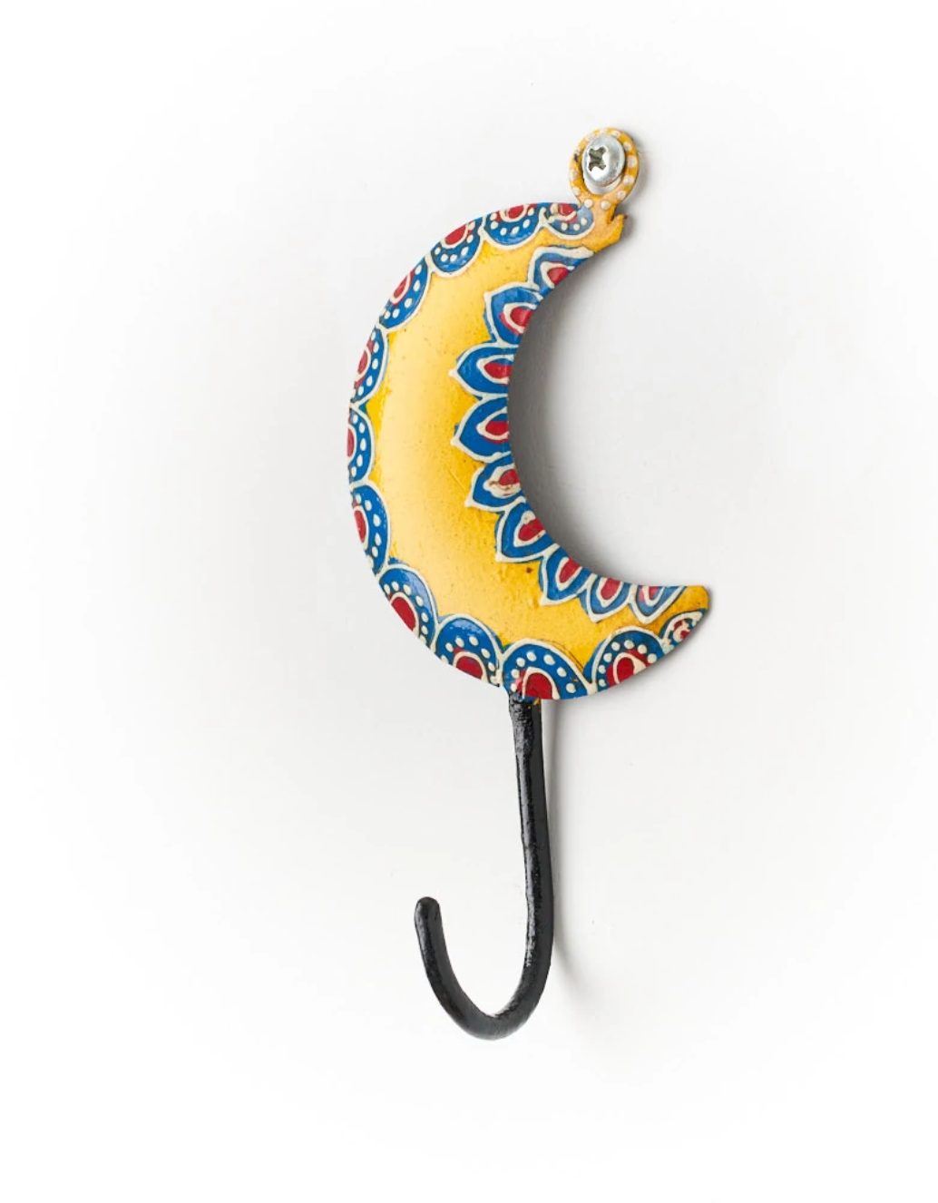 Our Henna Treasure Collection applies traditional artforms passed down for generations in the desert Kutch region of India, featuring handmade, upcycled iron elements with colorful, intricately hand painted detail. This unique wall-mounted hook features a vibrant crescent moon design and solid metal construction. The hand painted accents are added with precision, a rich expression of age-old Indian design motifs.