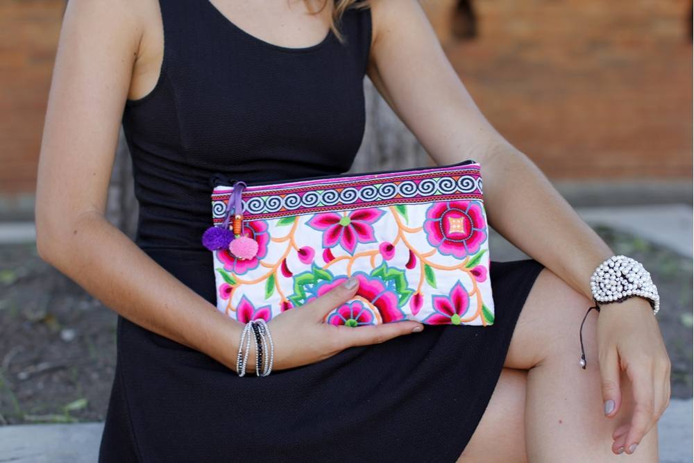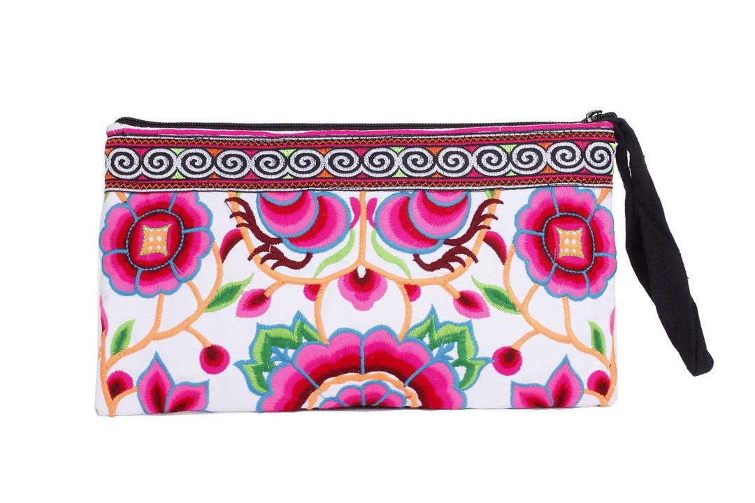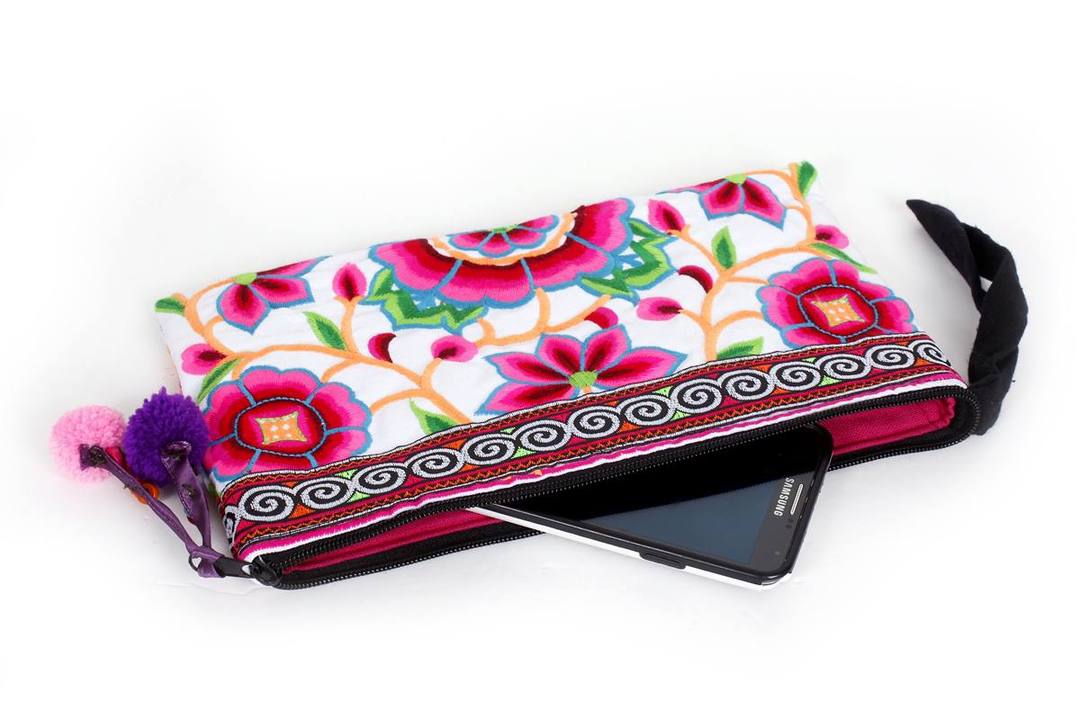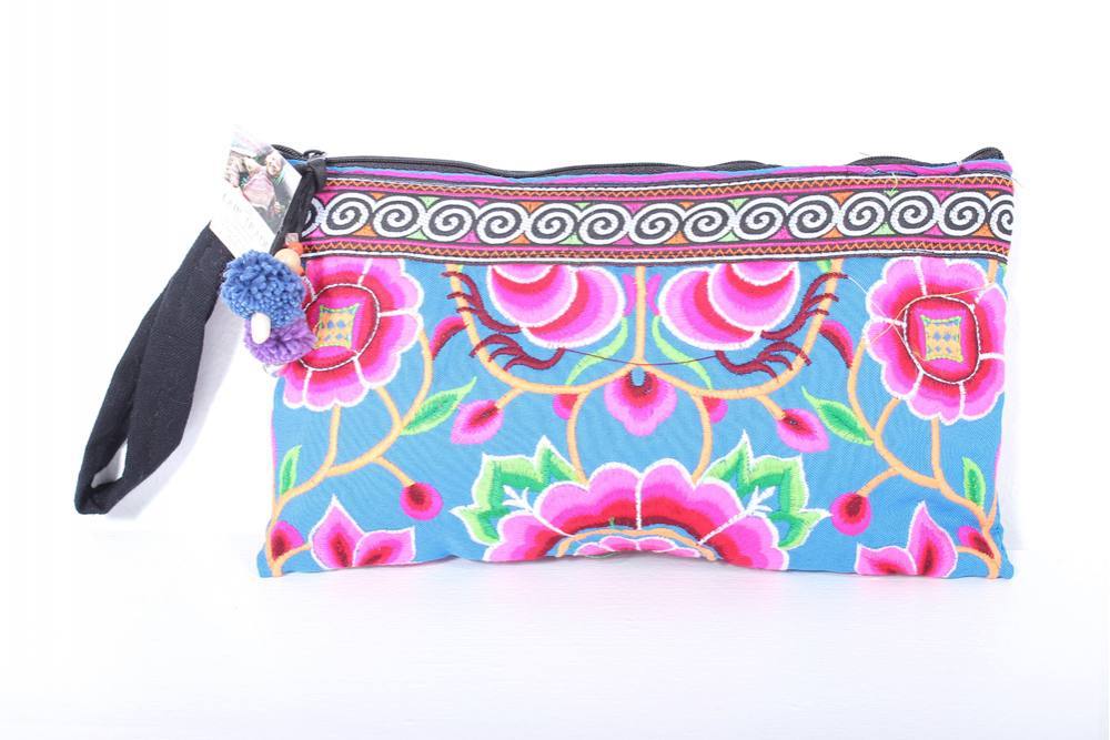 Our Hmong Happy Worm Wristlet is part of our Thailand Collection is a group of beautiful items handmade with an array of Hill-Tribe fabrics, handmade in Northern Thailand by our women artisans. The bag has a zipper closure and a fabric handle for your wrist.