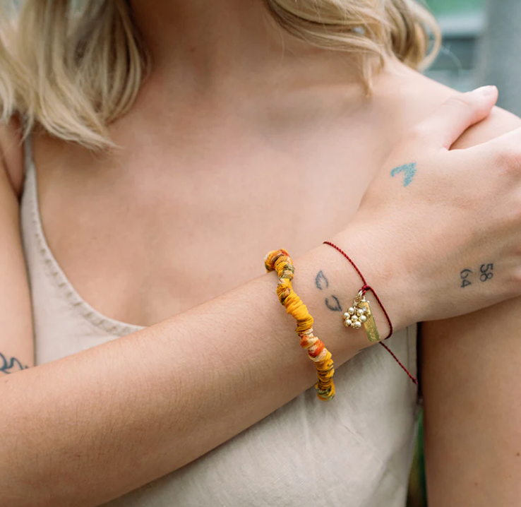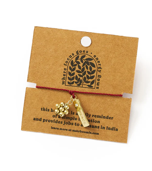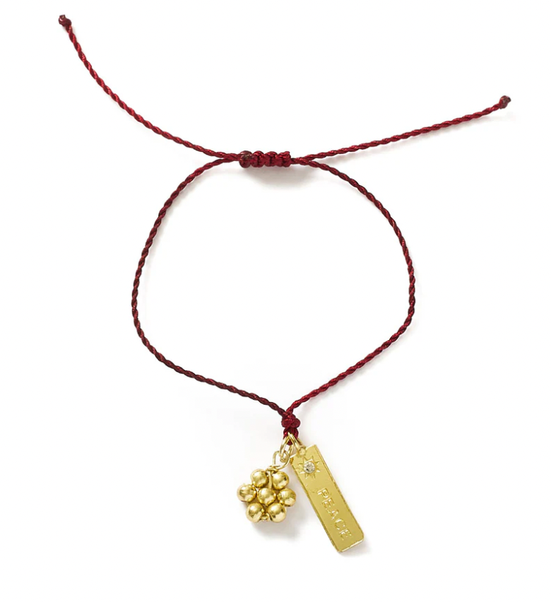 The Intention Bracelet - Peace features a hand beaded flower and a brass charm etched with the word “peace” and set with a delicate CZ stone. The red cord, a meaningful color in many cultures, adjusts with a pull-tie to accommodate a variety of wrist sizes. It serves as a daily reminder to the wearer to invite peace into their life—whatever that may mean to them. Wear or gift a single intention bracelet or together with others to create a meaningful stack!