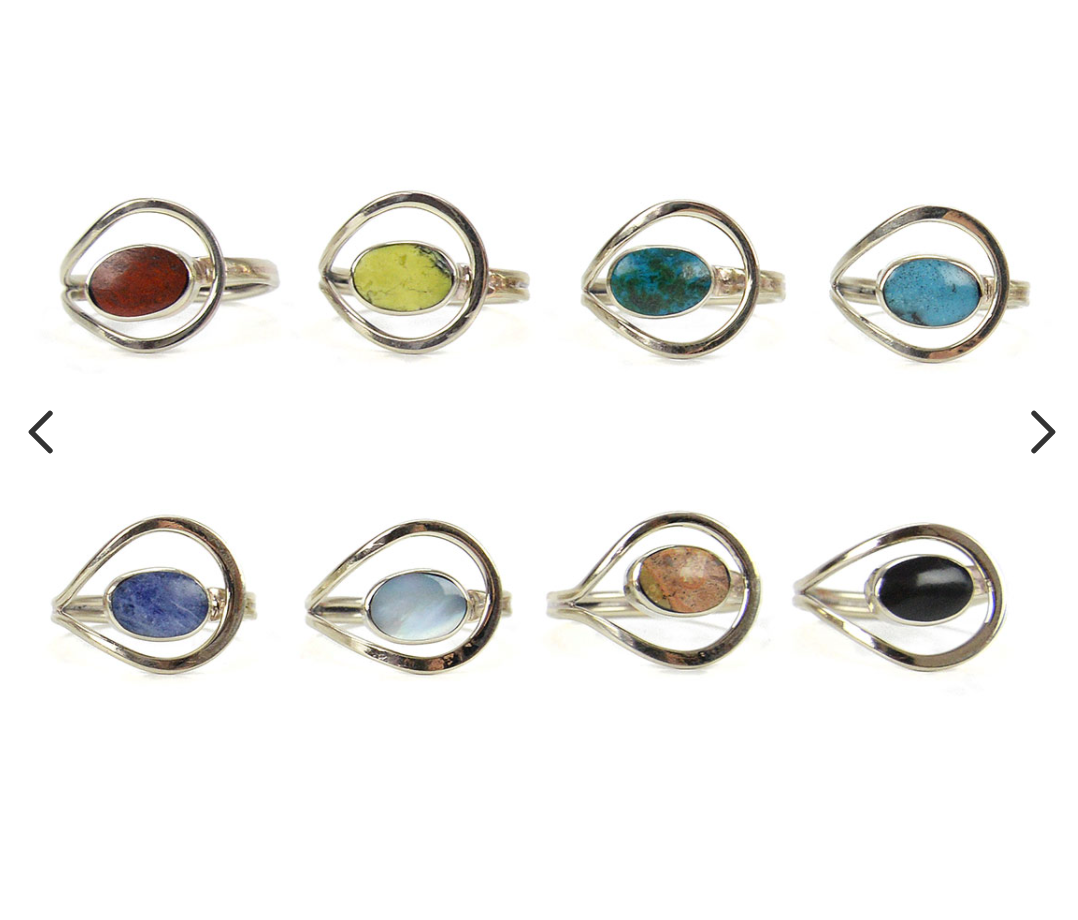 Alpaca silver ring with a unique loop design. Semi-precious stone setting. Adjustable. Colors vary. Made in Peru.
