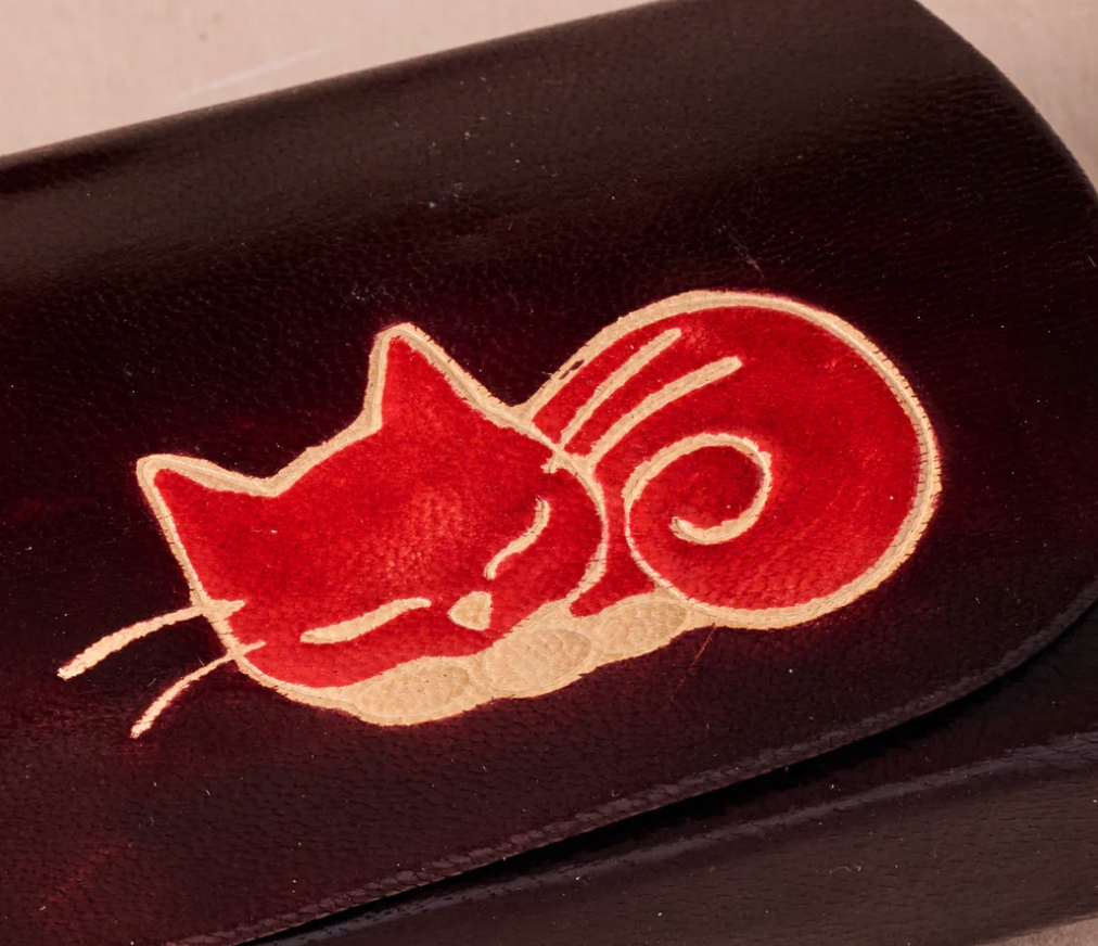 Tuck your specs into something purr-fectly charming. This gorgeous burgundy glasses case is made from supple goat leather, a by-product of the meat industry that might otherwise go to waste. It features a sweet sleeping cat in red and cream nestled in the corner adding a playful touch to the elegant design. Thoughtfully styled with a curved flap, secure silver snap closure and interior support for your frames, it’s equal parts function and feline flair. A cozy home for your glasses and a delightful gift for any cat lover. Handcrafted in India by the artisans of Craft Resource Center Pvt. Ltd. (CRC), a guaranteed Fair Trade Organization creating sustainable income opportunities for marginalized communities by blending traditional skills and ethical practices with globally competitive design, quality and innovation while preserving the dignity of labor and empowering artisans through fair trade, technology and skill development.
