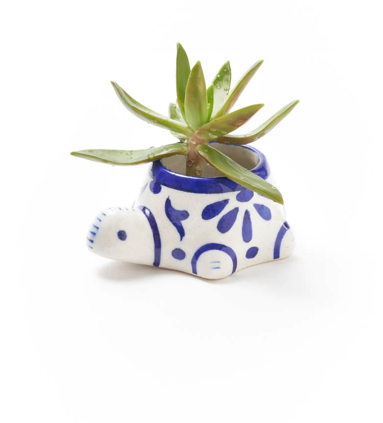 Our Lalita Indigo Collection features the master craftsmanship of Blue Pottery of Jaipur, with expertly sculpted designs, intricately hand painted detail, and lead-free glaze. Pottery is an age-old art form in India. Artisans in Rajasthan use a potter's wheel, handcrafted molds, and their hands to shape natural clay into beautiful works of functional art with a polished finish. This unique, succulent planter features a charming baby turtle design. Non-toxic paints in brilliant white and indigo are expertly applied by hand to bring the turtle to life. The rich, hand painted details are inspired by traditional Indian design motifs. Pair with our larger Lalita Indigo Succulent Planter - Mama Turtle for a delightful set.