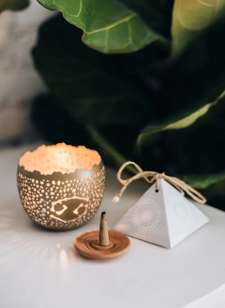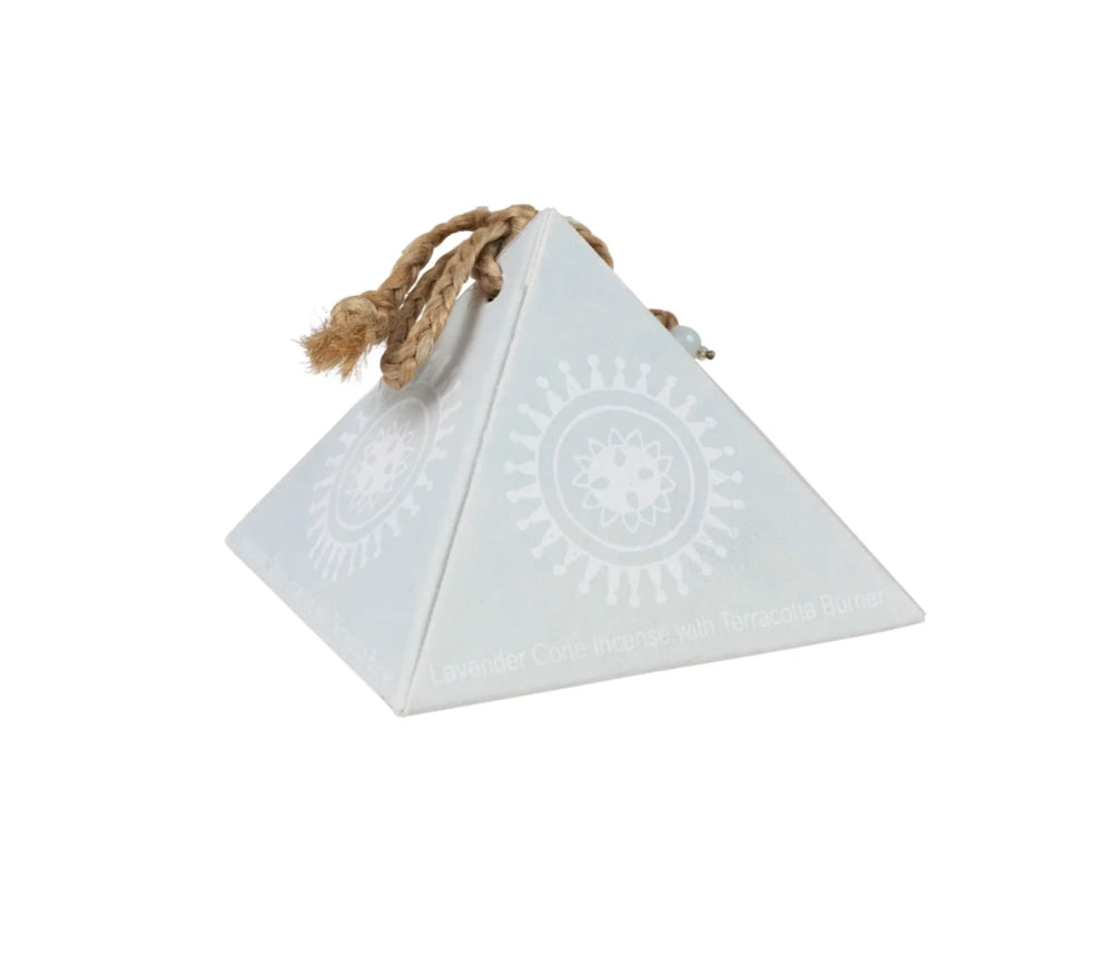 Enjoy the calming sensations from lavender aromatherapy with the Lavender Cone Incense Set made by artisans working with Silence in India. Set contains 10 lavender incense cones and a handcrafted terracotta incense burning plate, all in a mesh drawstring bag inside a paper pyramid box. Silence, our fair trade partners, offer people with disabilities opportunities for skills training and employment in handicrafts.