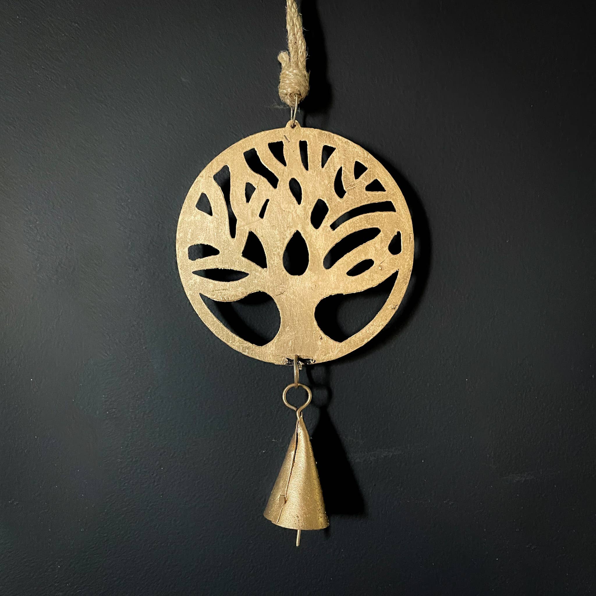 Our mini tree of life chime is one of our newest addition to the mini chime family. It features a simplistic tree cut-out and a cone-shaped bell at the bottom. The chime hangs on a jute thread and has an antiqued gold finish. If using outdoors we recommend spraying with a clear coat to prevent rusting. Metal chimes are made from flat sheets/pieces of scrap metal and created by using basic hand tools and machinery. Metalwork is a craft practiced in Behat in the northern state of Uttar Pradesh, India. Keywords: tree, wind chime, mini, cut out, gold, India, Fair trade, boho, outside, gardener, bell, spring, summer, ornament, gift, Mother's Day, Father's Day