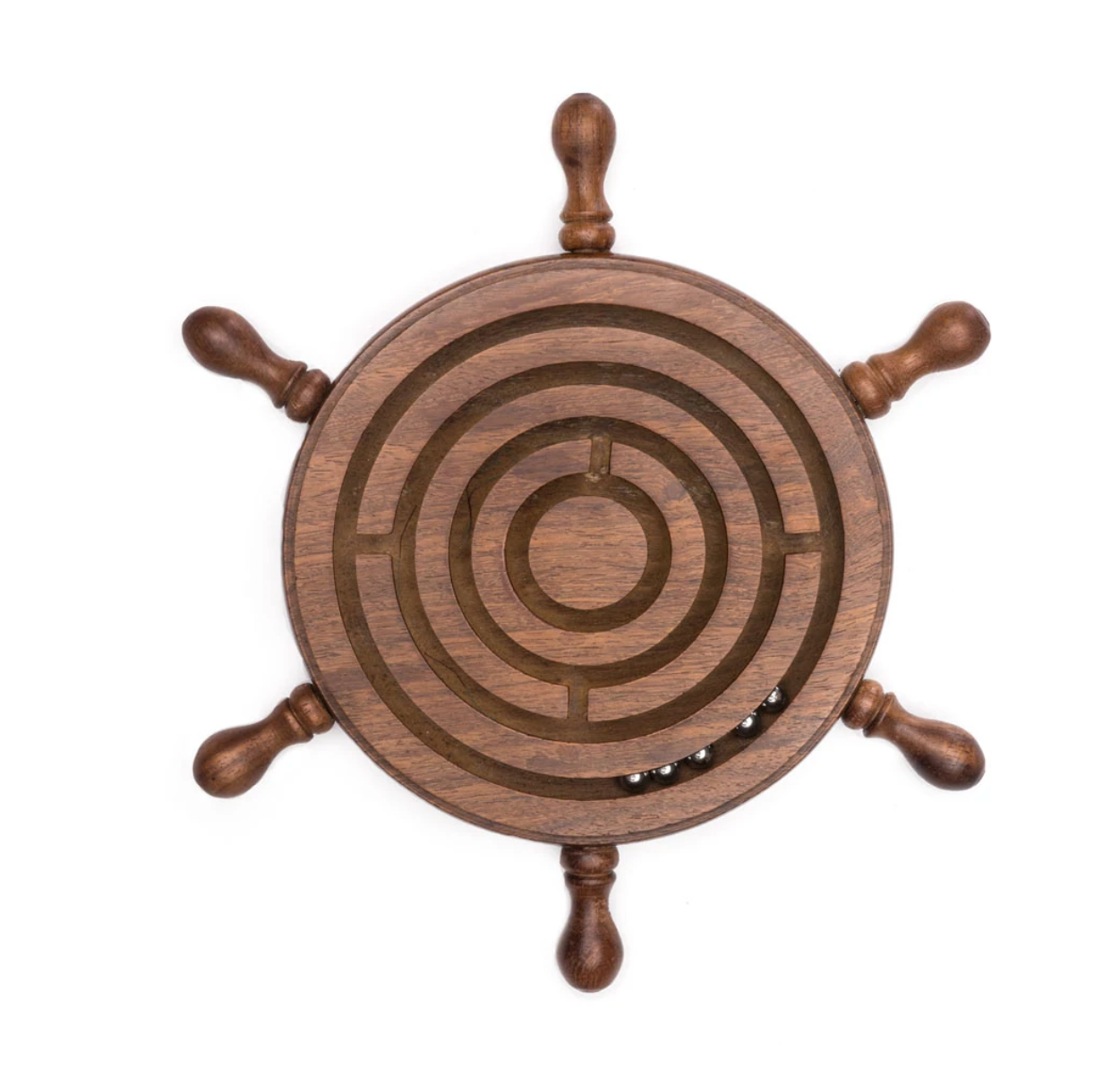 Hand carved, ethically sourced Indian rosewood labyrinth game in nautical wheel design.