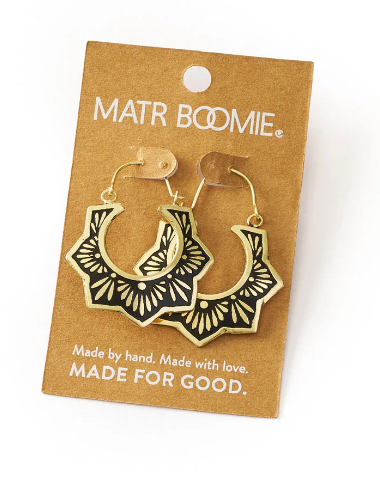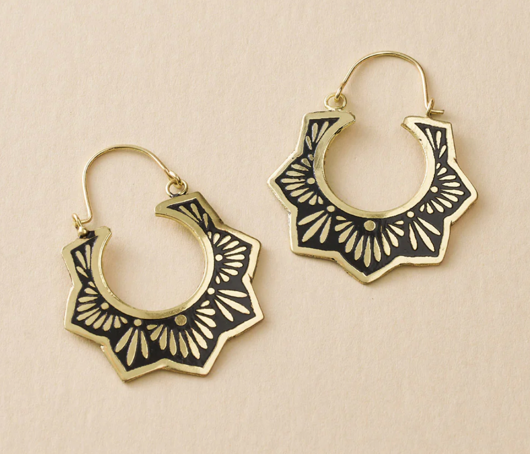 The Nisha Lotus Hoop Earrings feature a damascene jewelry making technique which gives them the gold tone on black effect. The dramatic effect would elevate any ensemble.