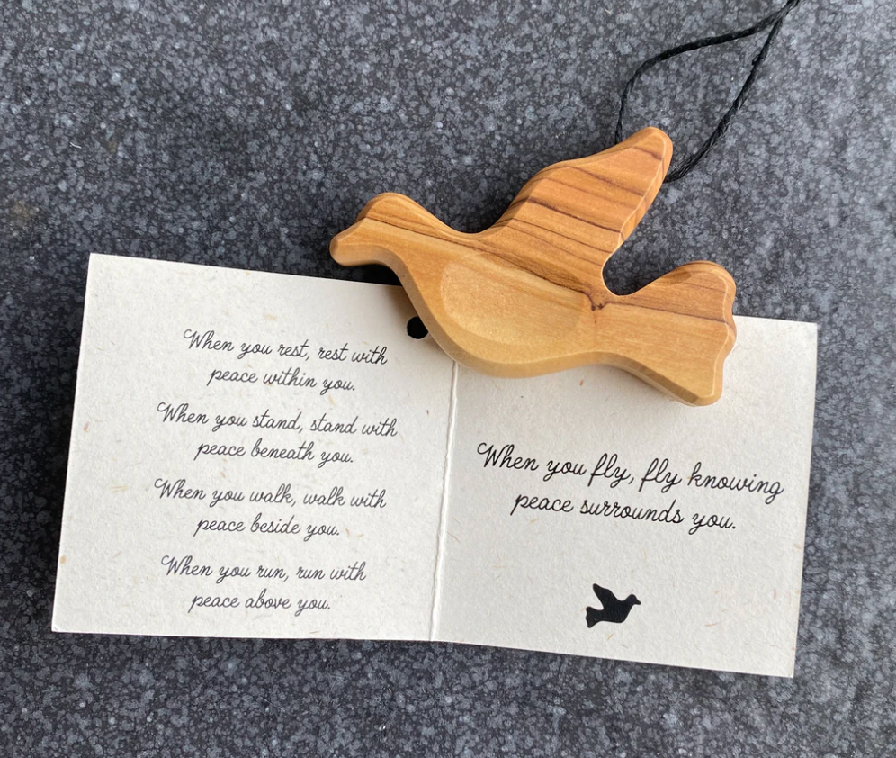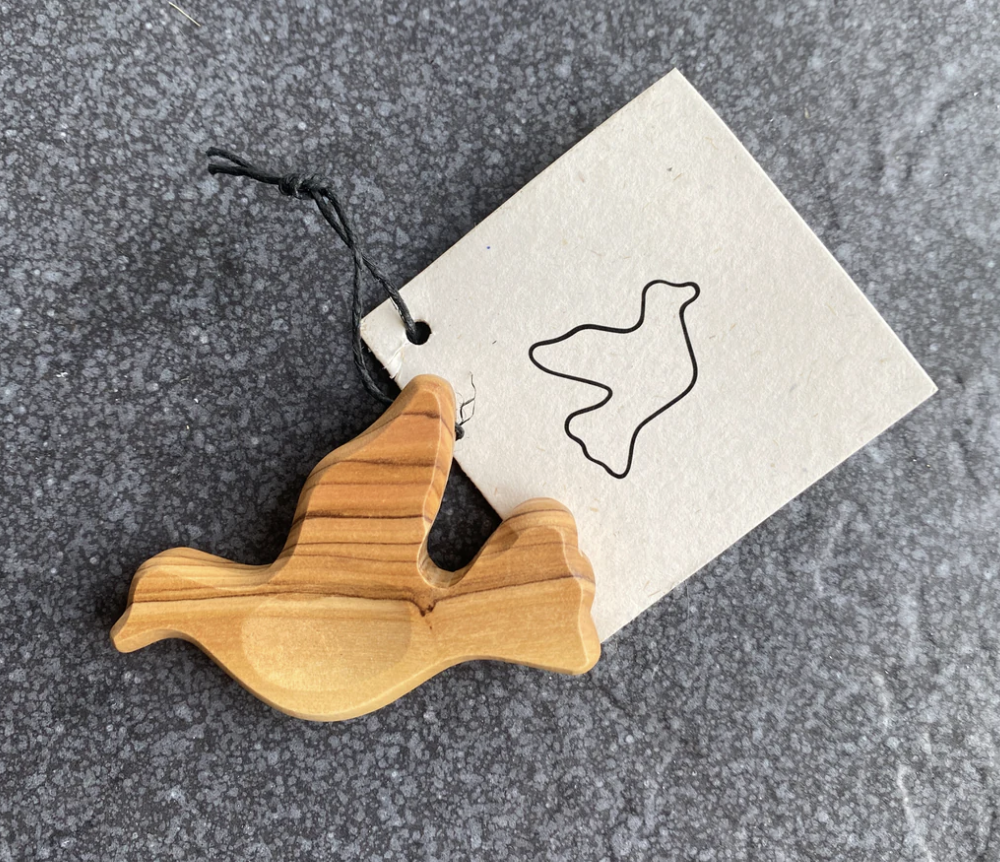 A beautifully carved piece as artistic as it is functional! Crafted from a single piece of Olive wood, the Peace Dove features an imprint designed to naturally cradle your thumb while holding it. If you prefer to utilize it as an ornament, a hole has been conveniently drilled in the wing to accommodate a wire, ribbon or cord for hanging. Includes a card for gift-giving. A Ten Thousand Villages Exclusive handcrafted in the Bethlehem area of the West Bank by artisans with Bethlehem Fair Trade Artisans (BFTA) which improves the lives of marginalized groups across Palestine.