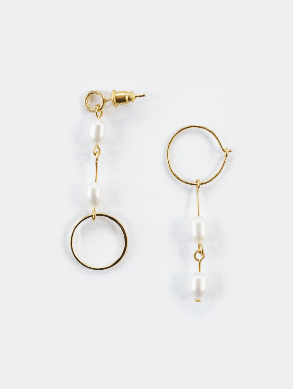 These asymmetrical earrings will add a touch of uniqueness for minimal jewelry lovers. Freshwater pearls dangle from brass to achieve the same-but-different look.