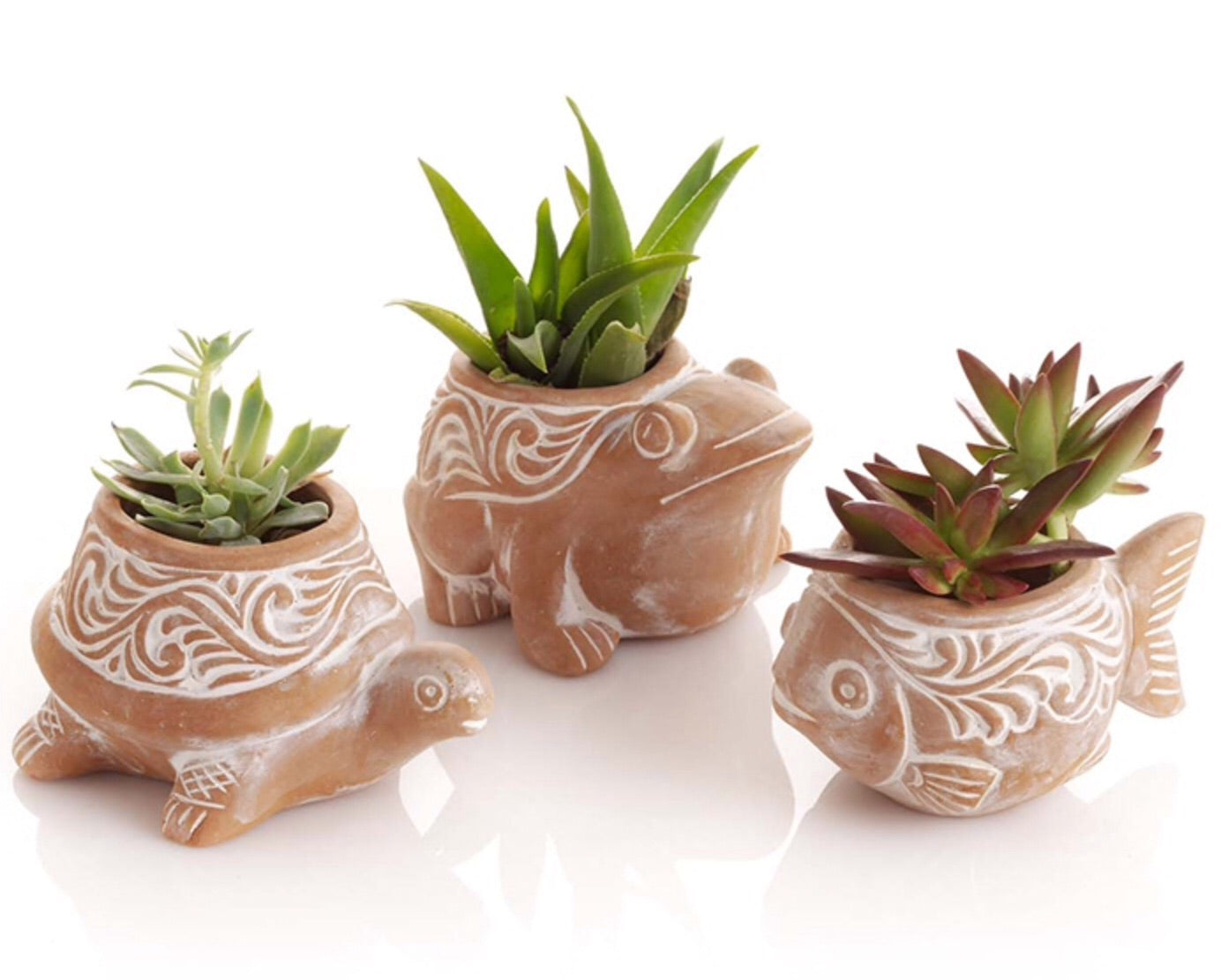 These little terracotta planters are ready to hold your favorite plants, with plenty of carved detail and personality to boot! Each has whitewash finish and a small drainage hole on bottom. Sold individually. Each approx. 3"h x 3 1/2"w x 5"d