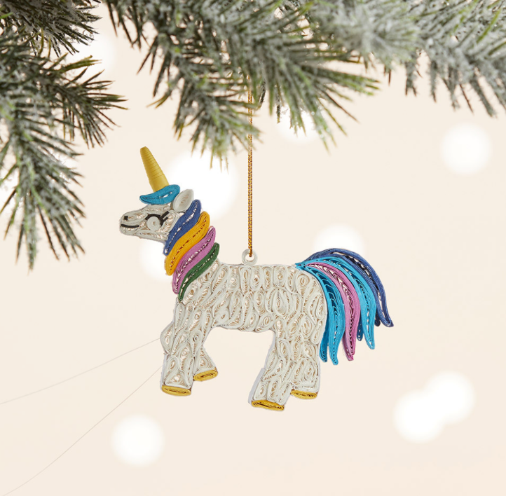 Nothing says magic quite like a unicorn! This fun quilled ornament is handcrafted from hundreds of tightly-coiled paper strips, and brings a touch of whimsy to your holiday tree. Attached cord...