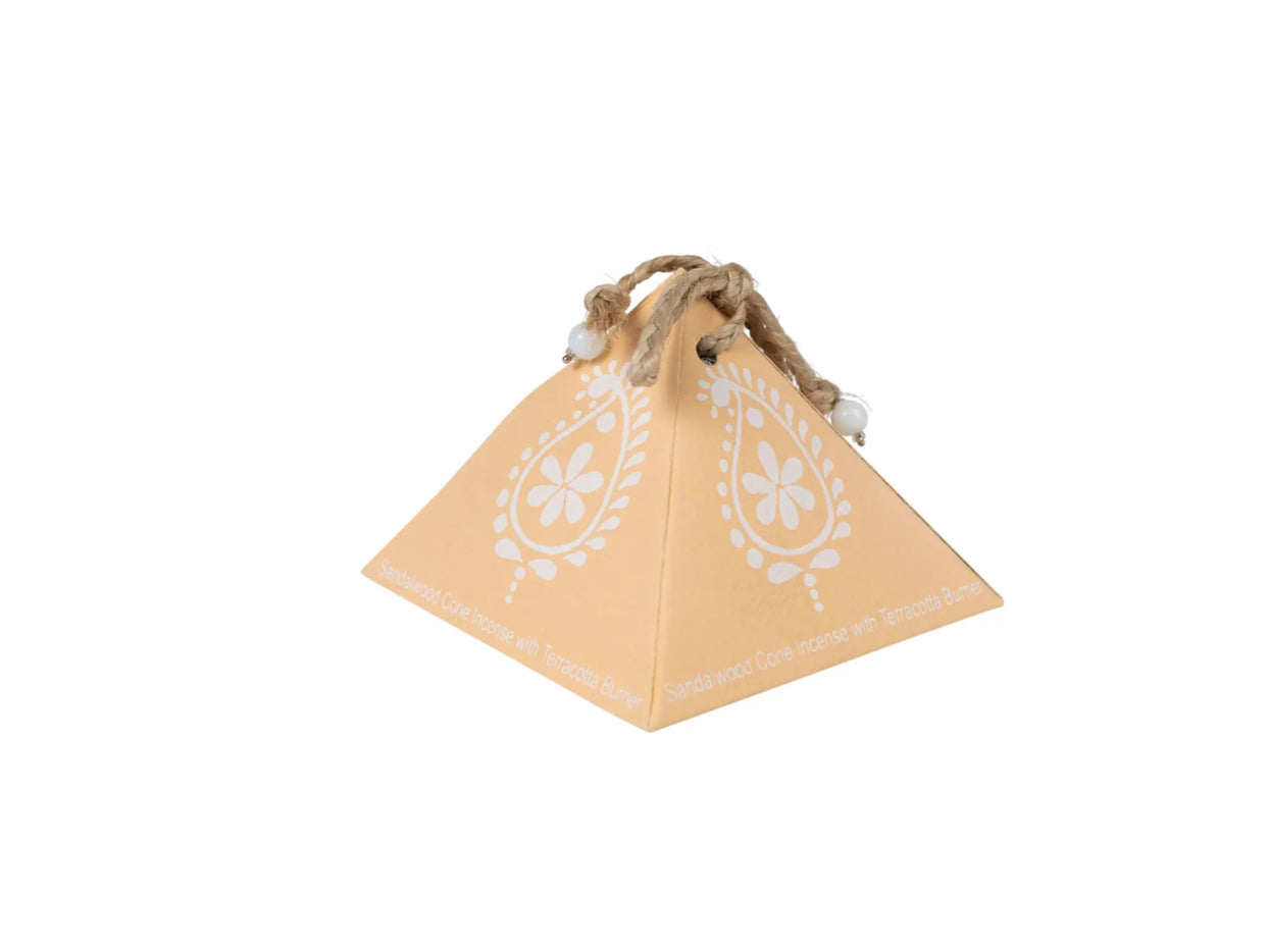 Enjoy the calming sensations from the sweet scent and aromatherapy of the Sandalwood Cone Incense Set made by artisans working with Silence in India. Set contains 10 sandalwood incense cones and a handcrafted terracotta incense burning plate, all in a mesh drawstring bag inside a paper pyramid box. Silence, our fair trade partners, offer people with disabilities opportunities for skills training and employment in handicrafts.