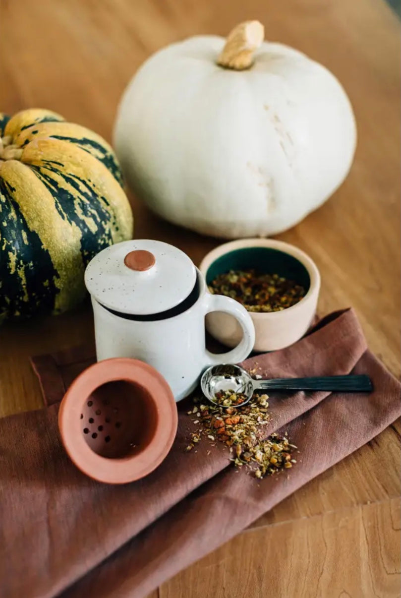 • White glaze with black spots on inside/outside of mug and lid. Tea strainer, base of mug, and knob of lid are unglazed.
