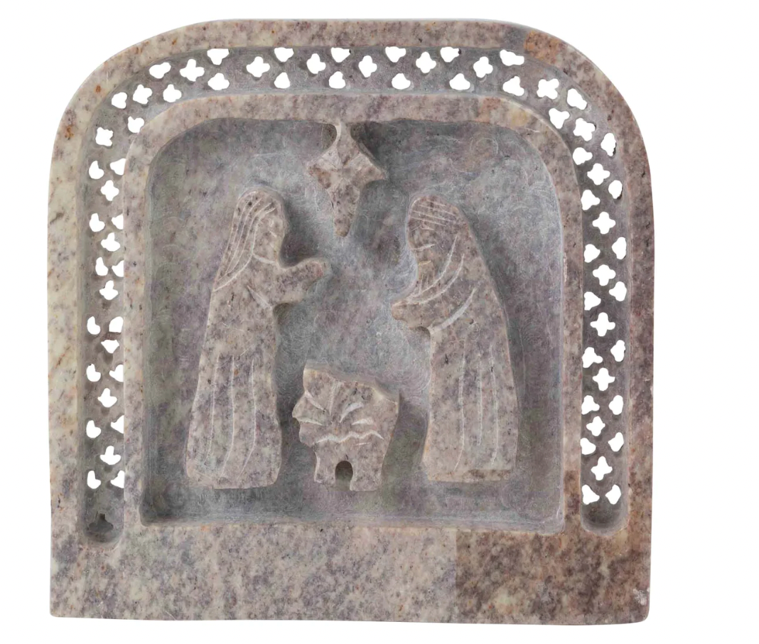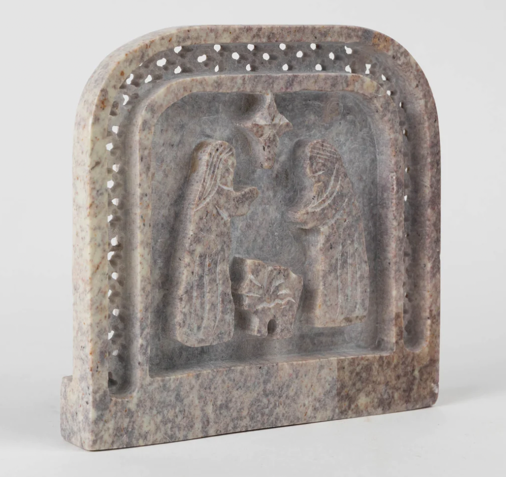 Elegant gorara Stone Sculpture Nativity handcarved. Mary and Joseph stand on either side of a manger, gazing at their newborn son in this beautifully handcarved soapstone nativity. A star hangs between them, symbolizing the call for hope of that first night.