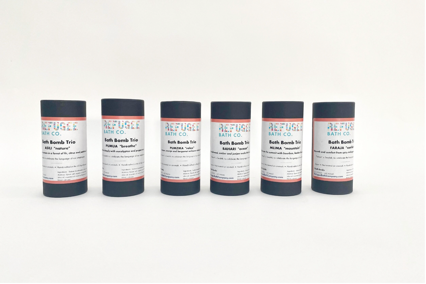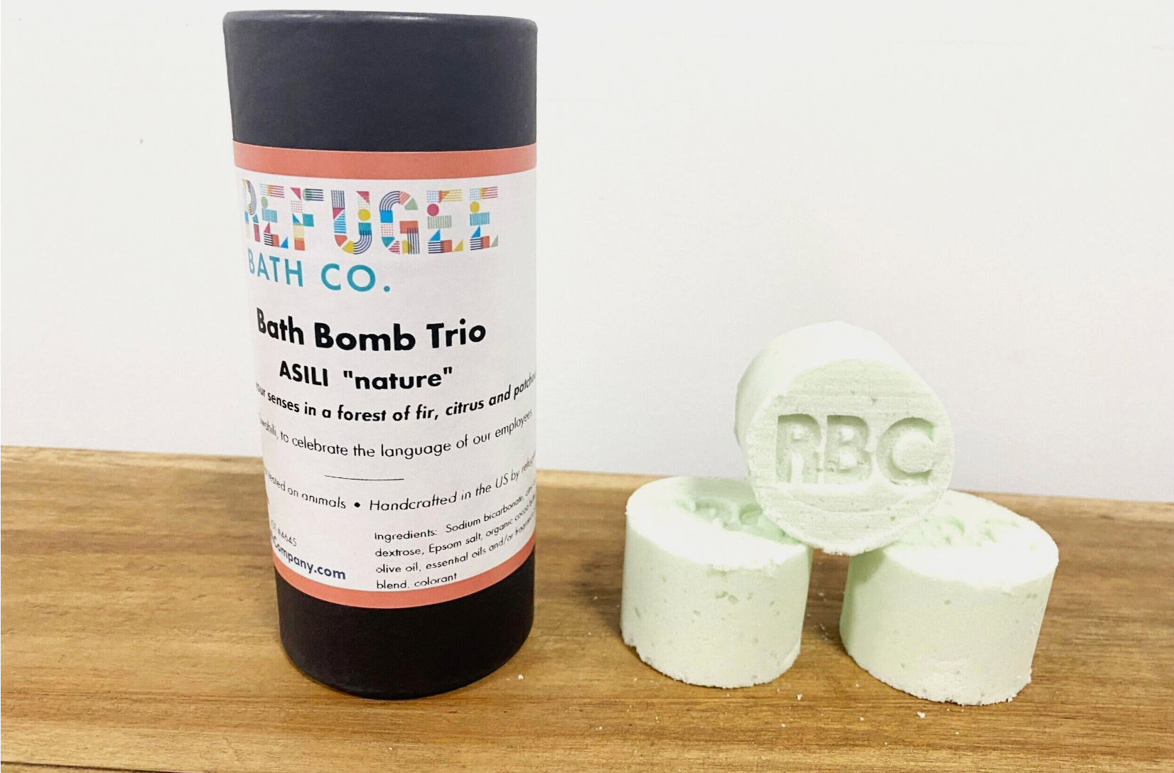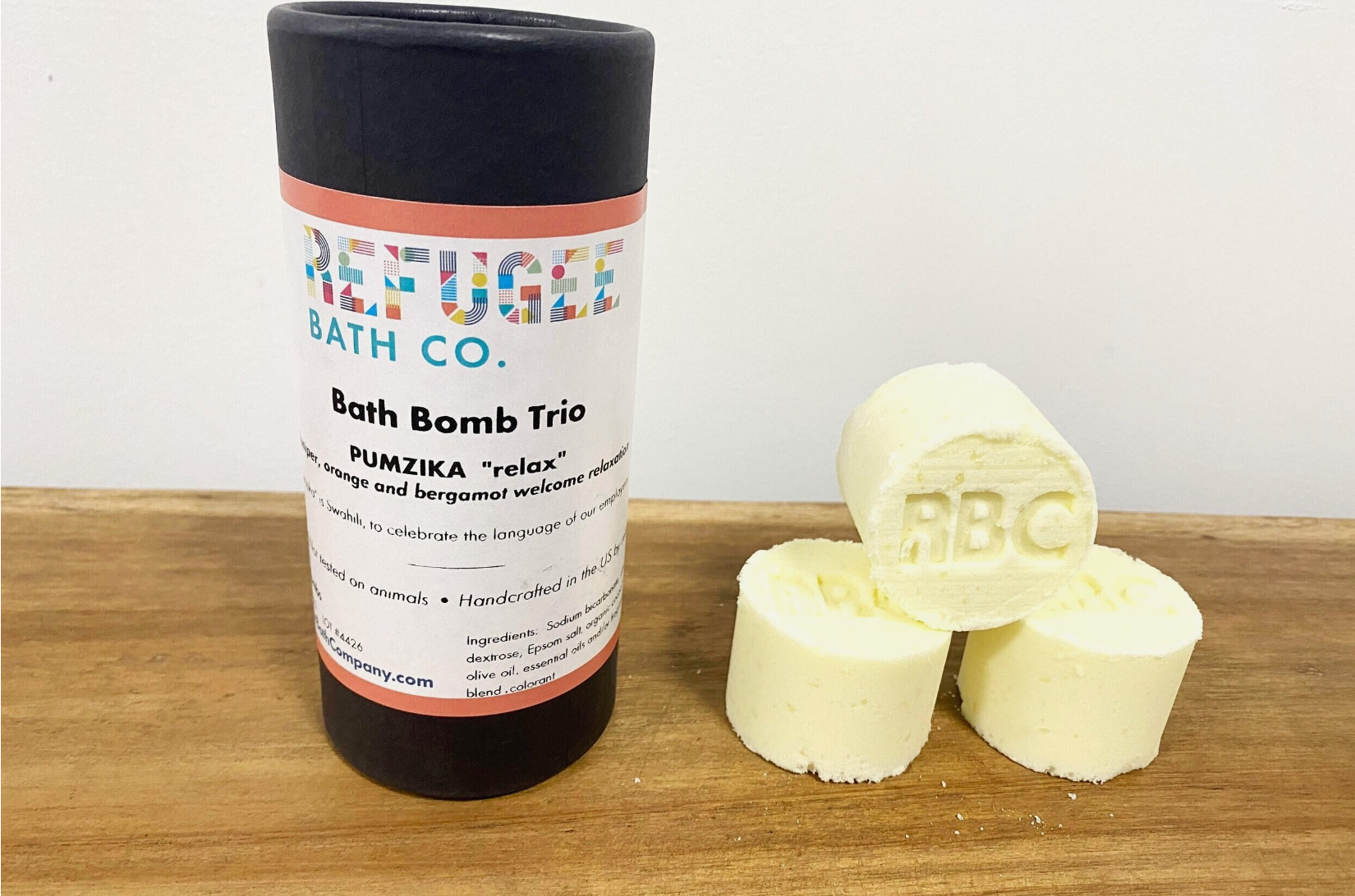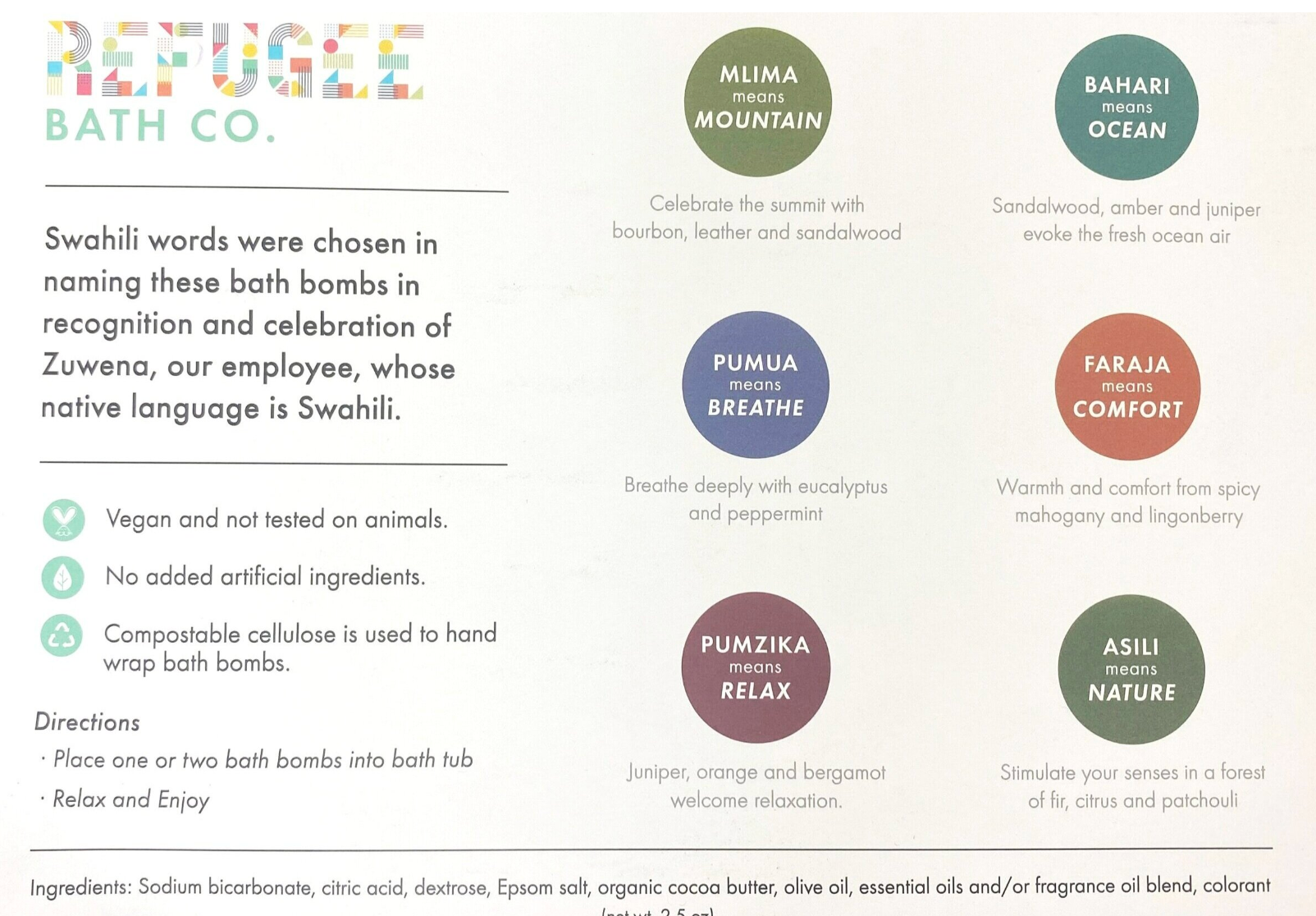 Our bath bombs are each proudly hand-made in Spokane Valley, Washington, by former refugees in our community. We use safe and naturally occurring ingredients. We avoid colors that stain the bathtub and irritate the skin. Each bath bomb contains organic cocoa butter to moisturize and condition the skin.