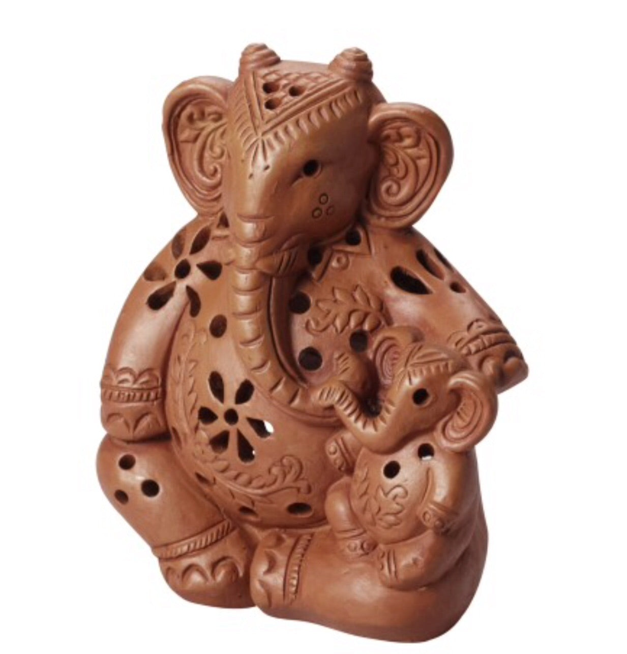 Whimsical tea light candleholder is ornately decorated. The terra cotta color wash, called “kosh” is made from catechu and mangosteen extract. Catechu is an astringent water-soluble substance extracted from the Asian acacia tree. It is used in medicine, in dyeing and in betel-leaf. Mangosteen is a tropical edible fruit. In Bangladesh, any sort of botanical extract is known as kosh.