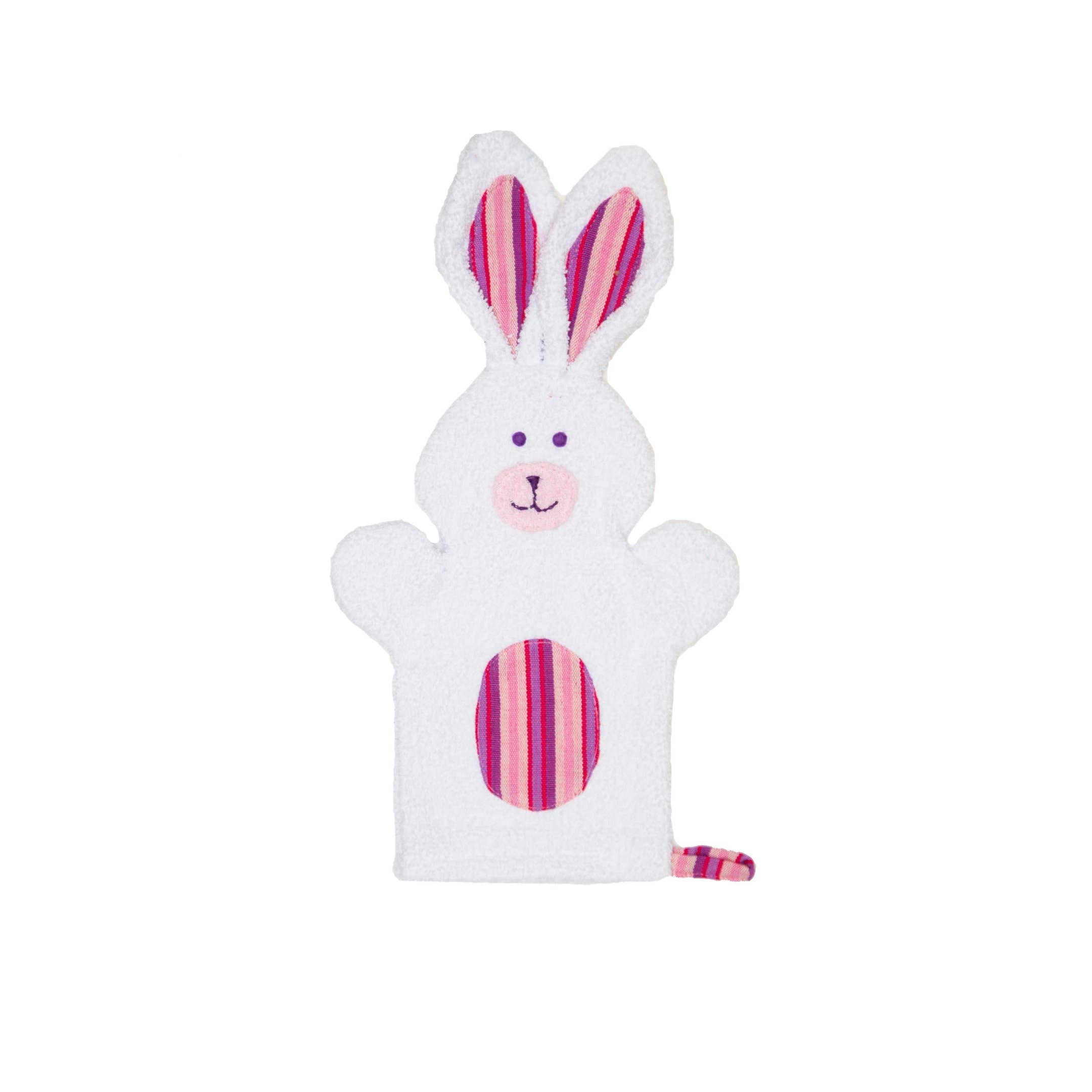 Your little one will have a hopping good time with this new bath time amigo! Each bunny puppet is made with soft terry cloth and features coordinating Guatemalan fabric accents. Handmade and fair trade! 13" x 7". 100% cotton terry cloth. 100% cotton accents. Assorted colors.