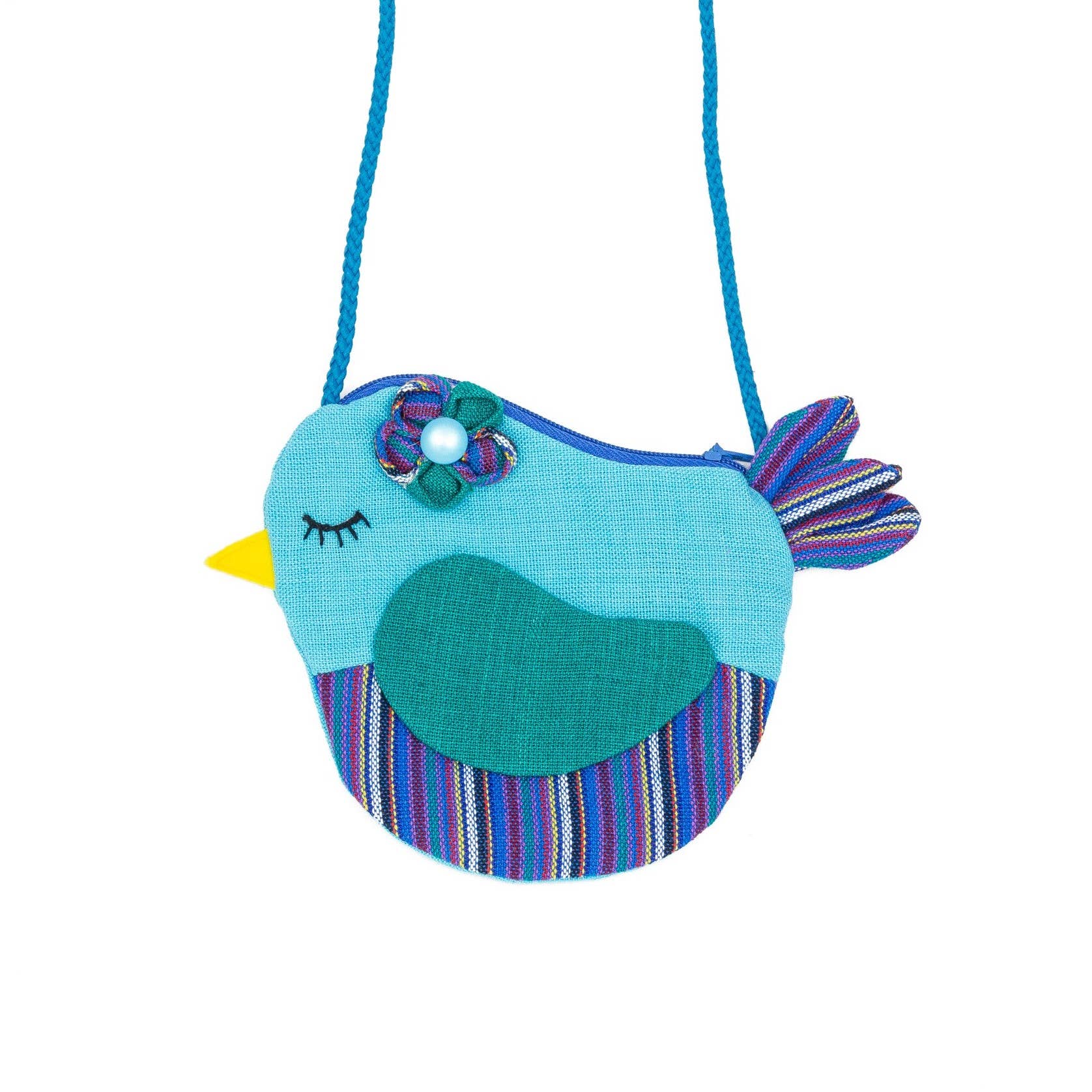 Chirp Chirp. This adorable birdie purse is made from traditional Guatemalan fabrics and is accented with a small flower. A zippered top keeps your riches intact! The long strap makes it perfect for girls ready to carry their very own purse. Also handy for carrying an I.D. and credit cards. Handmade and Fair Trade. Warning: CHOKING HAZARD: Small Parts. Not for Children Under 3 years old 5"W x 4 1/2"HStrap: 41" L100% CottonNylon ZipperAssorted Colors