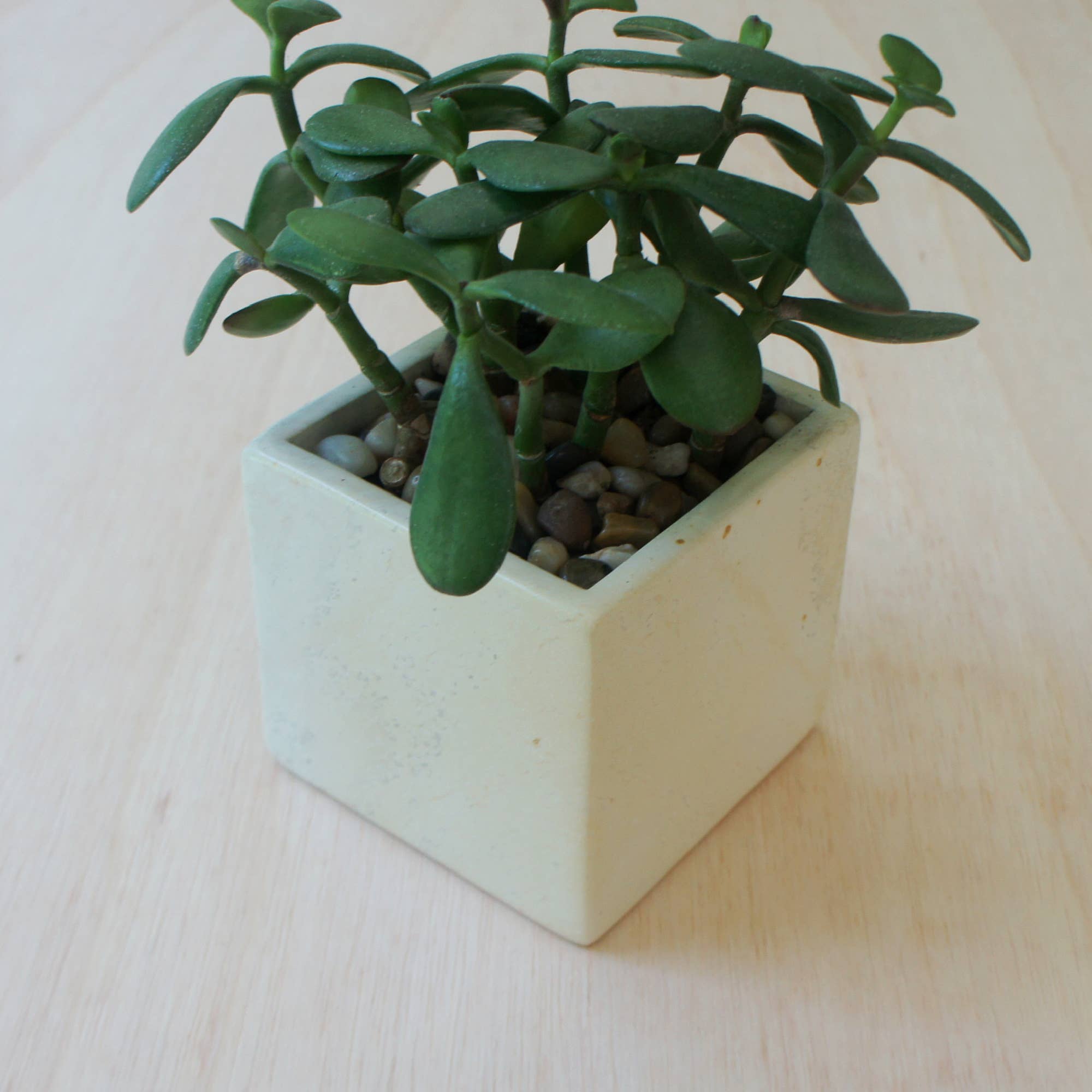This natural square planter is a fair trade product handmade in Kenya. It is hand carved out of stone and then sanded until smooth. Since the natural planter shows the natural colors of the stone, some color variations should be expected. One can often see shades of cream, gray, pink, and brown. This planter comes with a small drainage hole and can be ordered with or without the natural square tray base. They are best for air plants, succulents, faux plants, or to hold pens and other office supplies. Sold individually.