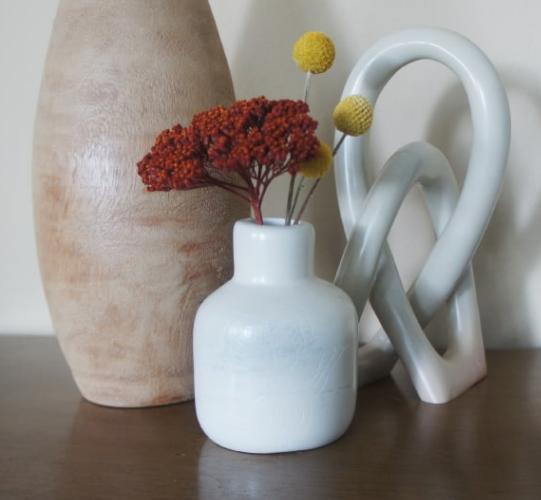 This natural vase is a fair trade product handmade in Kenya. Hand-carved out of stone and then sanded until smooth.c Since these vases show the natural colors of the stone, some color variations should be expected. One can often see shades of cream, gray, pink, and brown in the vases. Sold individually. In the picture with the white flowers, the medium vase is on the left, the large vase is in the middle, and the small vase is on the right.
