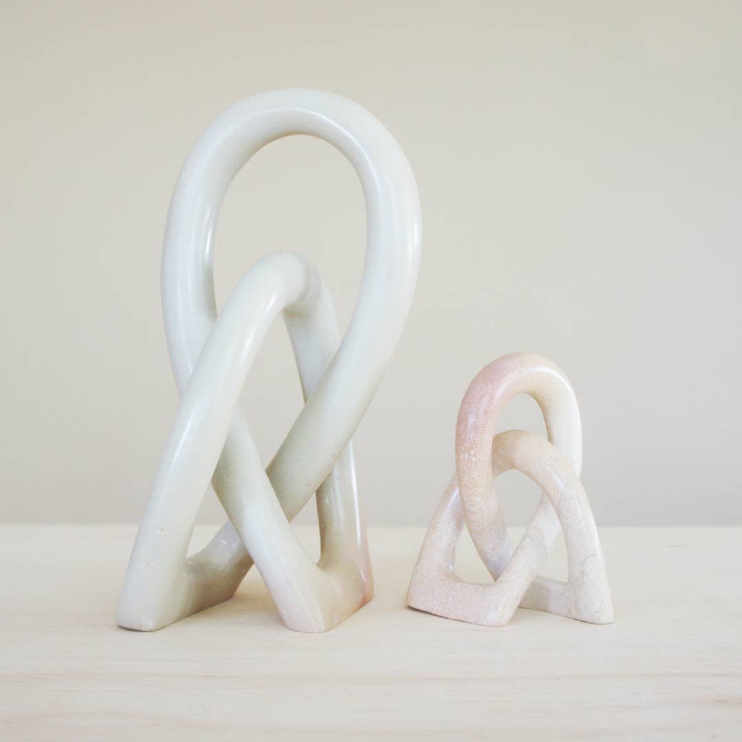 It is hand carved out of one piece of soapstone, sanded until smooth, and then polished. Since this product shows the natural colors of the stone, some color variations should be expected. One can often see shades of cream, gray, pink, and brown in the design. The two loops of the wedding knot stand for a couple that has become joined through marriage, but remain two individual people. The sculpture is given to a couple on their wedding day with a blessing.