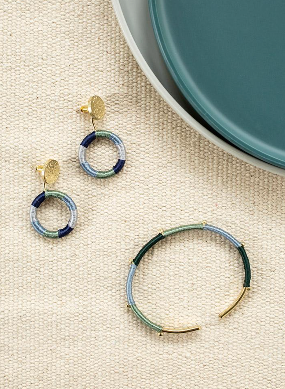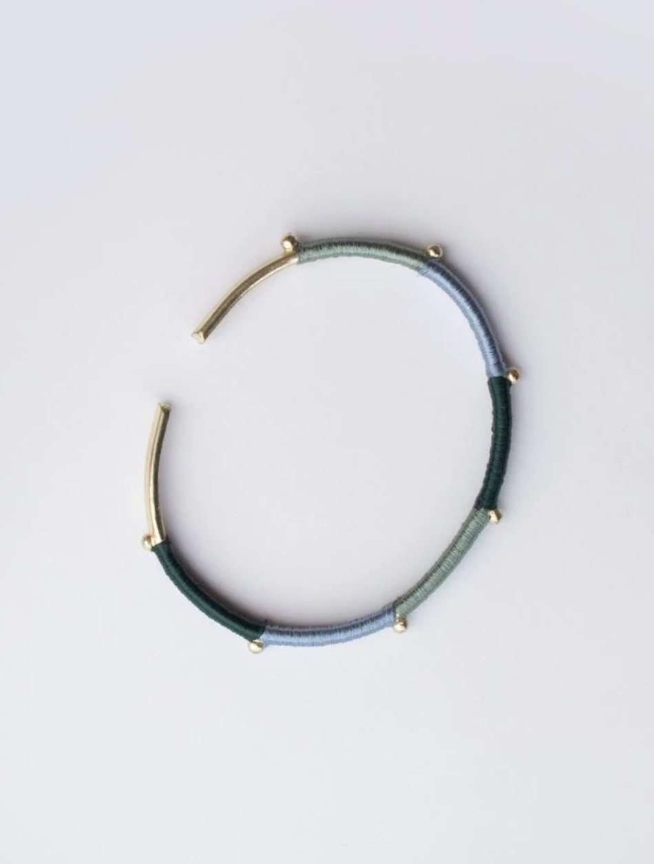 Create an AccountPale green and blue colored threads join subtle brass details in this intricate bracelet. Add some interest to your look with this subtle accent.