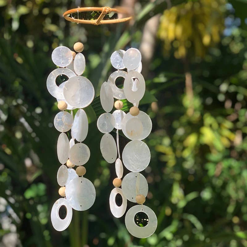 Dimensions — 5”D x 15” (13cmD x 38cm) ~~~~~~ Our capiz chimes are made up of a stunning array of shapes and colors. They sparkle in the light, and when placed outside, create a gentle tinkling of the shells. Our capiz supply comes from a fishing village in Java, where our shell artisans sustainably harvest the shells and shape them. All parts of the capiz (jingle oyster) are used; the meat is used for food, the main part of the shell for handicraft, and the shell waste for fertilizer. Only full-grown shells are picked from the kelp beds, where they grow, which provides more space and food source for the young ones to grow. All our Capiz chimes are made with care in our fair trade, in-house workshop in Bali.