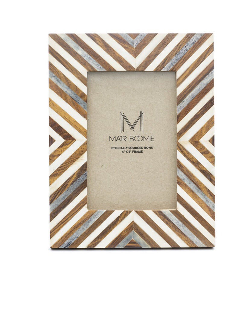 Handcrafted rectangle frame features ethically sourced bone and wood inlay in mountain design with soft black hand-painted accents. Accommodates a 4" x 6" photograph or print. Explore complementary styles within our Banka Mundi Collection.