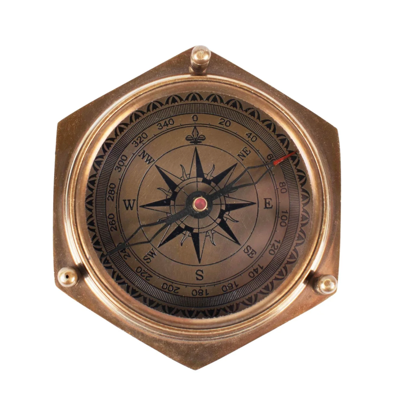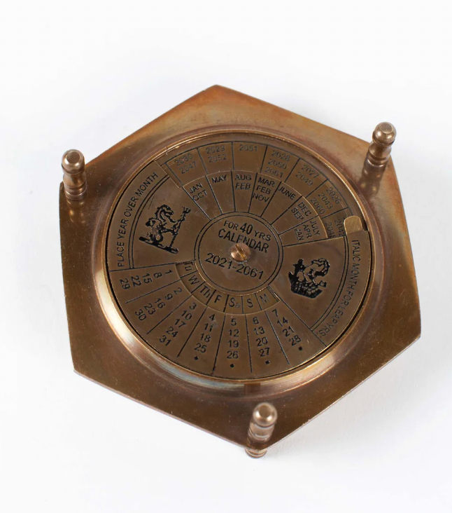 - Compass on one side and 40‒year calendar (starting in 2021) on the opposite side. Three antiqued oxidized brass posts/feet (measuring a total of 1.5H inches) are positioned to keep the compass/calendar elevated from table surface.