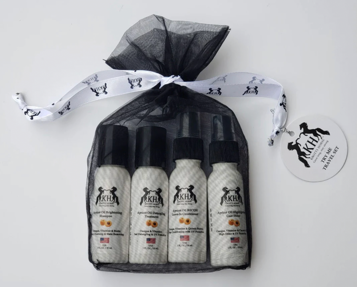 The Try Me Travel Set features individual 1 oz. sizes of all 4 Knotty Horse Apricot Oil & Omega-based formulas of Brightening Shampoo, RECON Leave-In Conditioner, Detangling Treatment and Highlighting Coat Shine. It's the perfect gift to treat yourself or the equestrian in your life. Our signature Apricot scent and visible results will make you a believer! Packaged in an eco-friendly, re-usable black organza drawstring bag. Suitable for sensitive skin types.