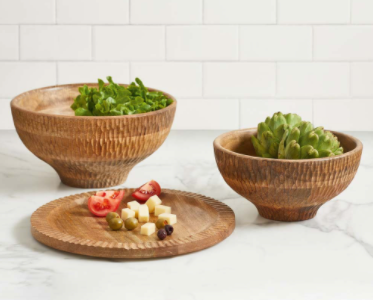 This bowl features a beautiful hand-carved texture, sourced from sustainably harvested mango wood trees. 4 1/2"h x 9 1/2"dia.