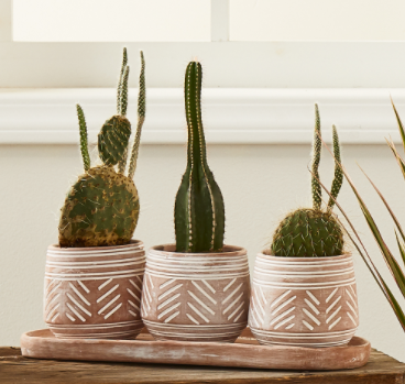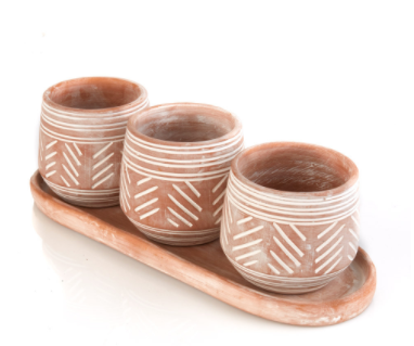 Whitewashed terracotta is incised with stripes and chevrons to create a simple, yet elegant trio of planters. Drainage hole in each pot. Lip on tray helps keep planters in place. Tray: 13 3/4"l x 5"w x 1"h; Pots: 3 3/4"h x 3 1/2" dia.