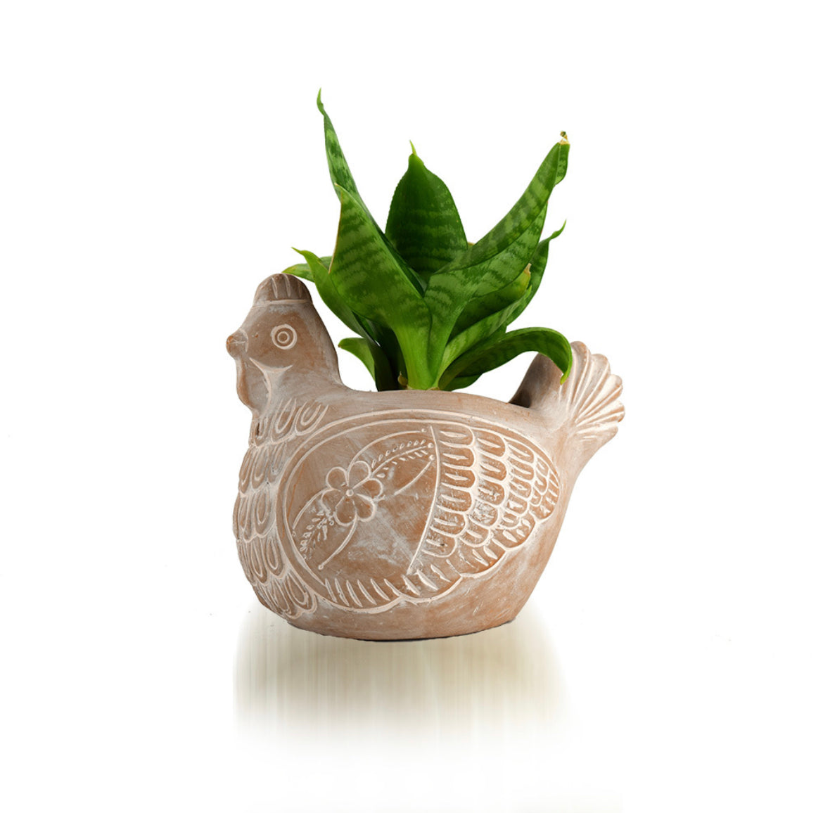 Bring the farm to your home and garden! This cute little chicken garden planter features natural terracotta clay incised with traditional designs and whitewashed for rustic appeal. Great for smaller flowers, succulents and more. No drainage hole. 6"h x 8"w x 5 1/2"d