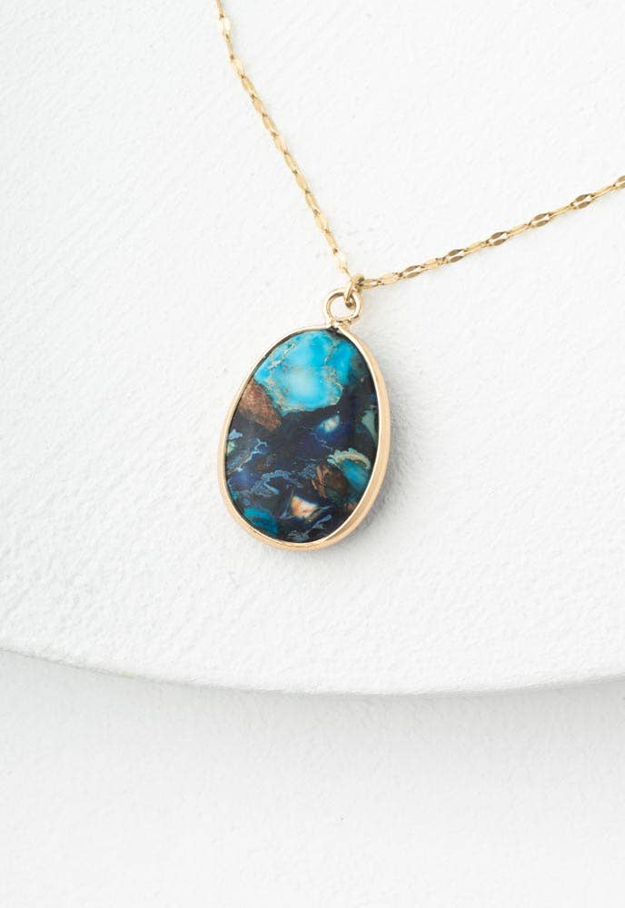 Our Cascade Necklace is every shade of refreshing water coming together. Rich blue and turquoise flow together around accents of white, and bronze marbling within the jasper stone framed in 14K...