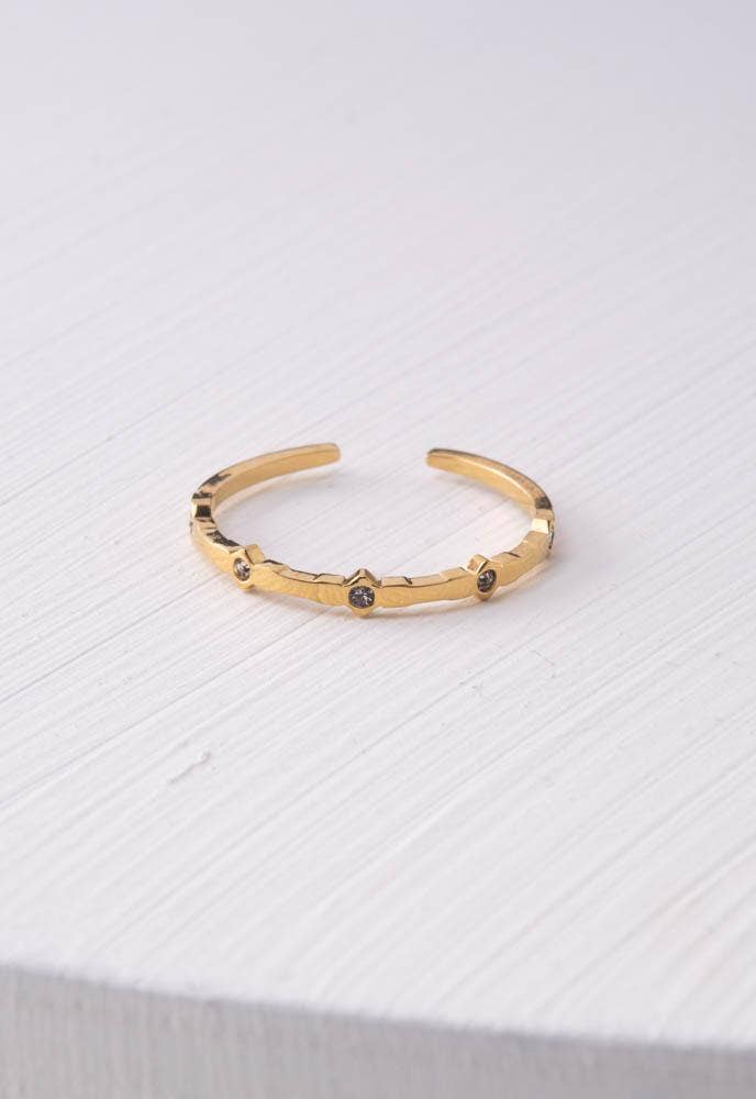 Our adjustable 14k gold plated Christina Ring features five of the daintiest zircon stones that will shine for years to come. Like Christina, this piece makes a beautiful, effortless statement on its own yet loves to be with friends. Stack the Christina and Becca rings for a match made in chic heaven! Box size and color may vary. Materials: Stainless steel ring plated with 14K gold Hypoallergenic; lead and cadmium free with nickel content less than 100 ppm. Size: 2.8 inches