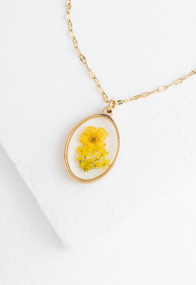 Our In Bloom Necklace showcases the beauty of nature, in bloom. Dried yellow flowers are encased in clear resin within a 14K gold plated setting. Each delicate flower reminds us of...